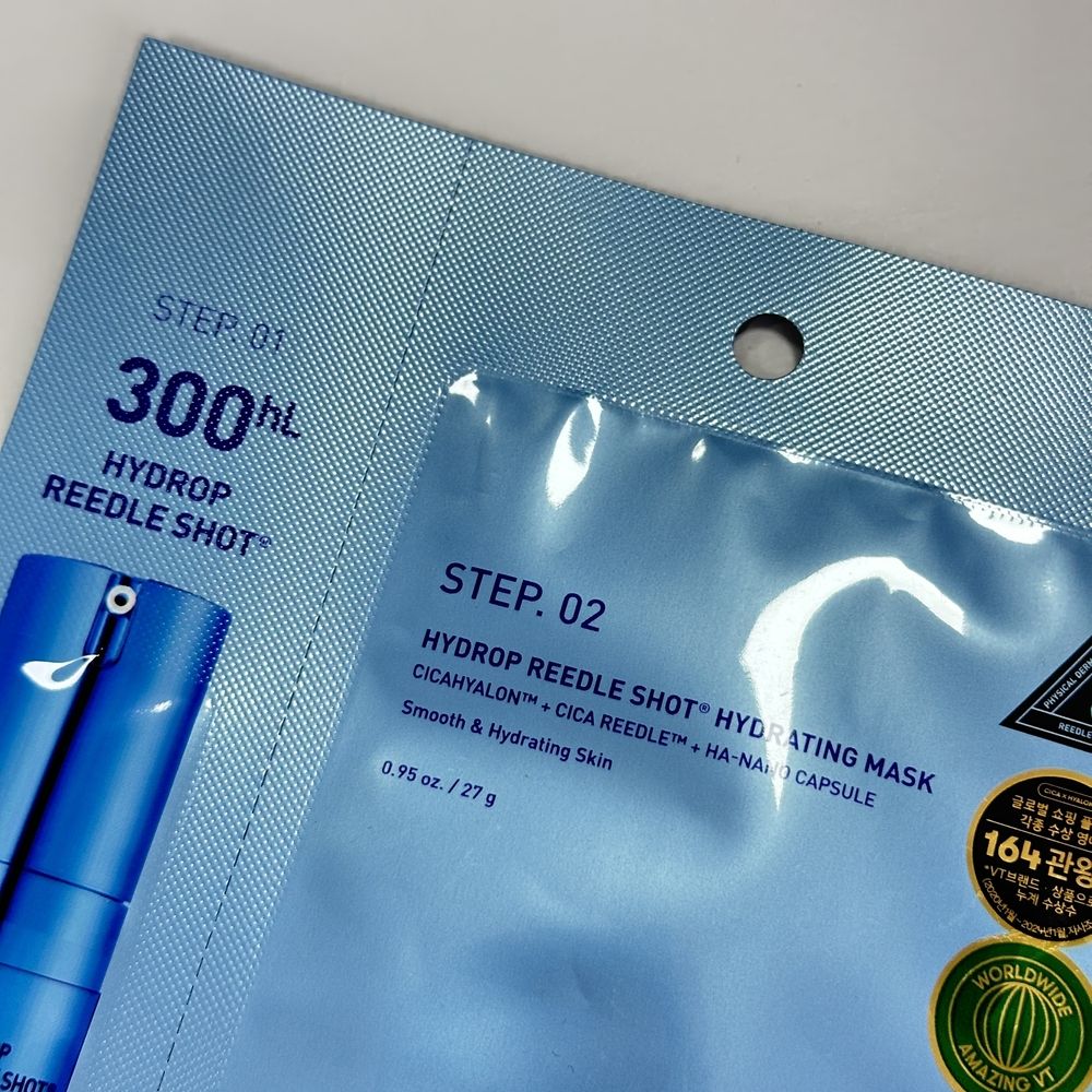 - Шаг 1: Hydrop Reedle Shot 300hL: - Гелевая эссенция мягко ложится на кожу, проникая вглубь эпидермиса, обеспечивая непрерывное увлажнение и свежесть.