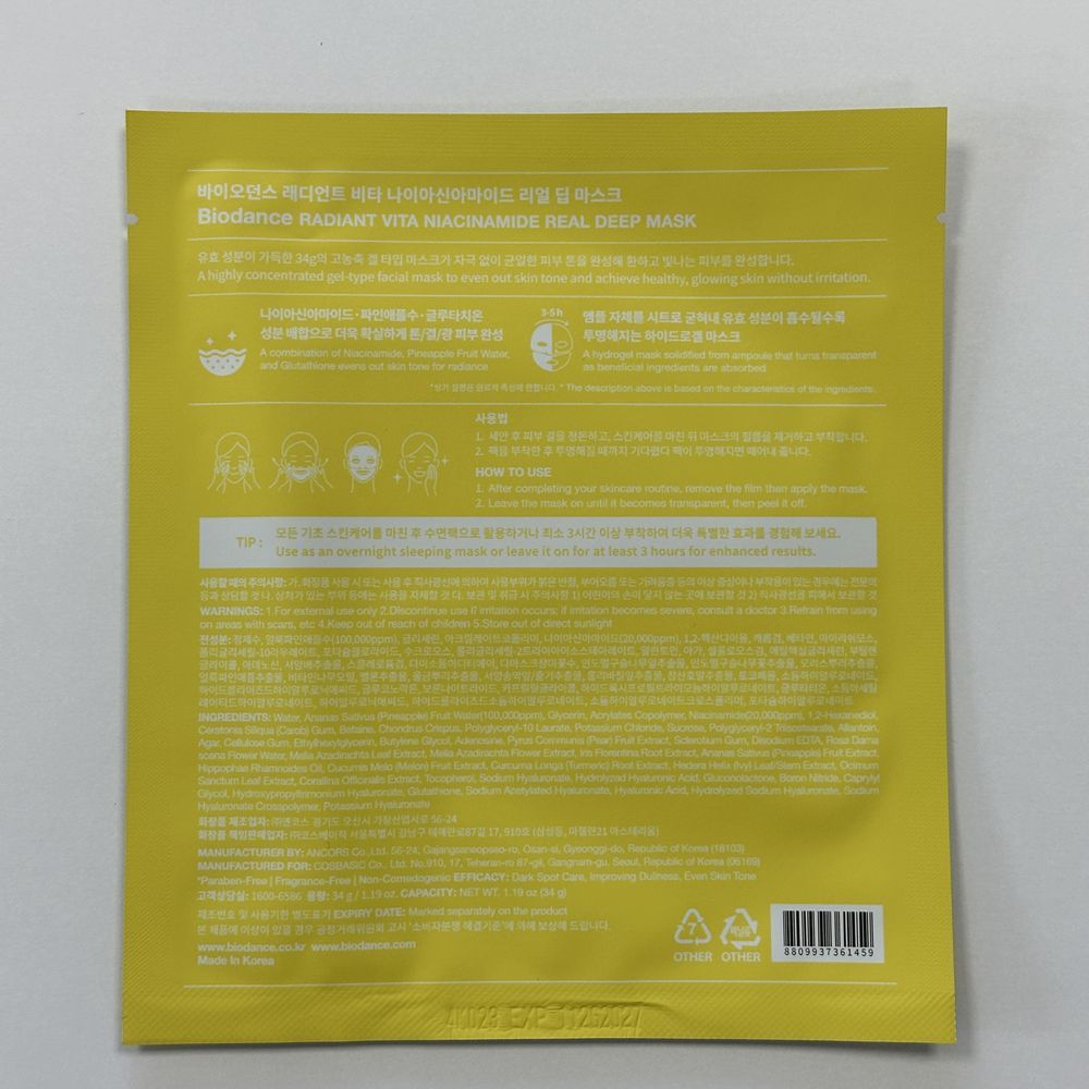 Витаминная гидрогелевая маска способствует гладкому и сияющему цвету лица, устраняя тусклость, пигментацию, неоднородный тон, следы стресса и усталости. BIODANCE Radiant Vita Niacinamide Real Deep Mask улучшает состояние рубцов, застойных пятен и постакне. Состоит из двух частей (для нижней и верхней части лица), предназначена для нанесения на всю ночь или минимум на 3-4 часа. Основание из гидрогеля обеспечивает увлажняющий и тонизирующий эффект без раздражения. После того как кожа впитывает активные вещества ампульной эссенции, маска становится прозрачной. Маска изготовлена из безопасных, нетоксичных и гипоаллергенных ингредиентов, протестирована дерматологами и подходит для чувствительной и подверженной акне кожи. Рекомендуется для тусклой кожи с неравномерным тоном, при пигментации.