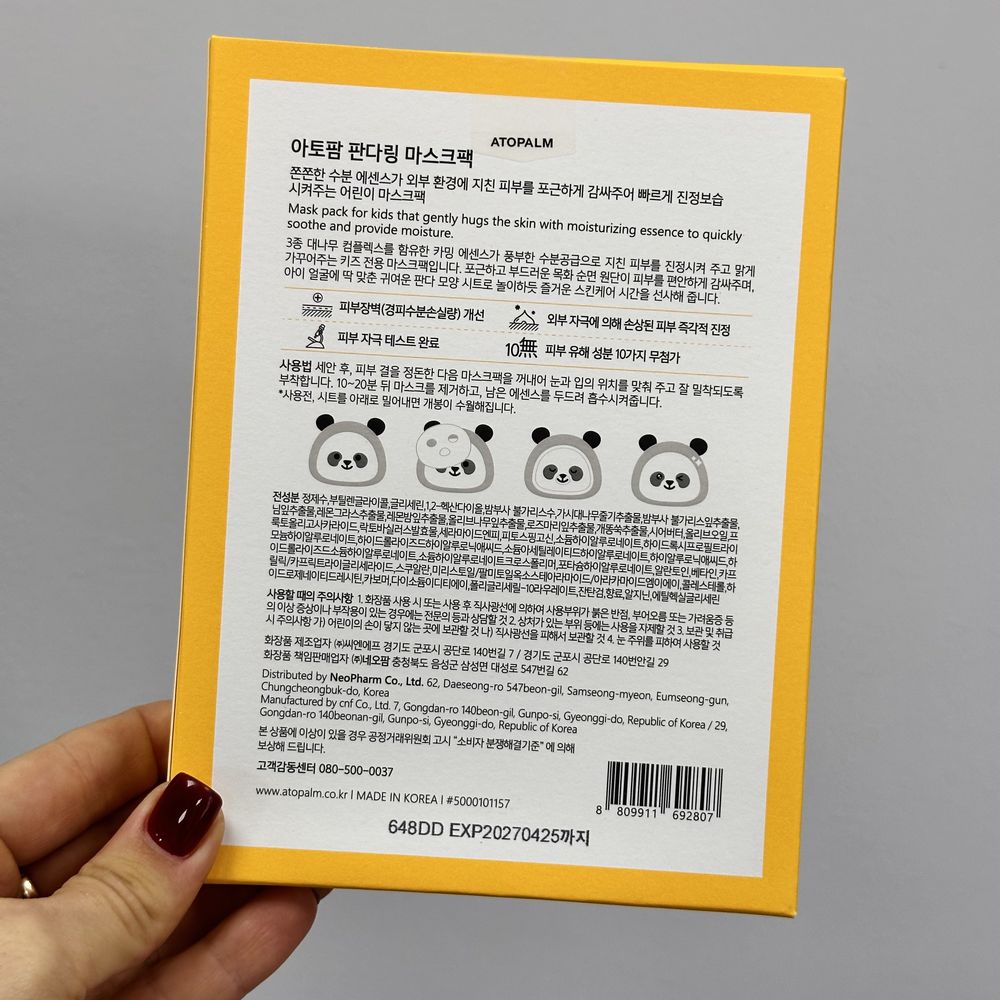 Тканевая маска для юных «бьютиголиков», которые с детства увлечены косметикой и красотой. Маска обеспечивает увлажняющий и успокаивающий эффект на нежную детскую кожу. Также ATOPALM Pandaring Mask Pack Kids улучшает состояние кожи детей, которые длительное время находятся в помещениях с кондиционерами. Лекало изготовлено из 100% чистого хлопка, имеет идеальный размер для детского лица, а форма милой панды особо привлекает юных любительниц маминых косметичек. Основа пропитана эссенцией обогащенной смесью бамбука, гиалуроновой кислоты и керамидов, которые успокаивают, защищают и активно наполняют питательными веществами поврежденную и обезвоженную кожу. В составе безопасные активы, одобрены EWG. Не содержит вредных веществ, средство подходит даже для кожи с повышенной чувствительностью.
