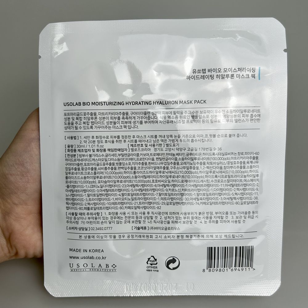 Тканевая ультра увлажняющая маска для сухой, обезвоженной кожи с успокаивающим действием. Интенсивно увлажняет кожу, купирует воспаления, а также способствует лечению купероза. Снимает раздражения и покраснения, снижает чувствительность и обеспечивает комфортные ощущения и придаёт здоровое сияние. Наполняет клетки дермы влагой и питательными компонентам, которые помогают клеткам лучше удерживать влагу внутри эпидермиса. Восстанавливает и усиливает защитный барьер поврежденной и ослабленной кожи, способствует заживлению ран, уменьшению зуда и покраснений. Повышает упругость и эластичность кожного покрова, ускоряет обновление клеток и укрепляет тургор эпидермиса за счет высокого содержания пептидов в составе. USOLAB Bio Moisturizing Hydrating Hyaluron Mask Pack имеет удобную форму лекала, плотно прилегает к лицу и максимально насыщает кожный покров полезными веществами.