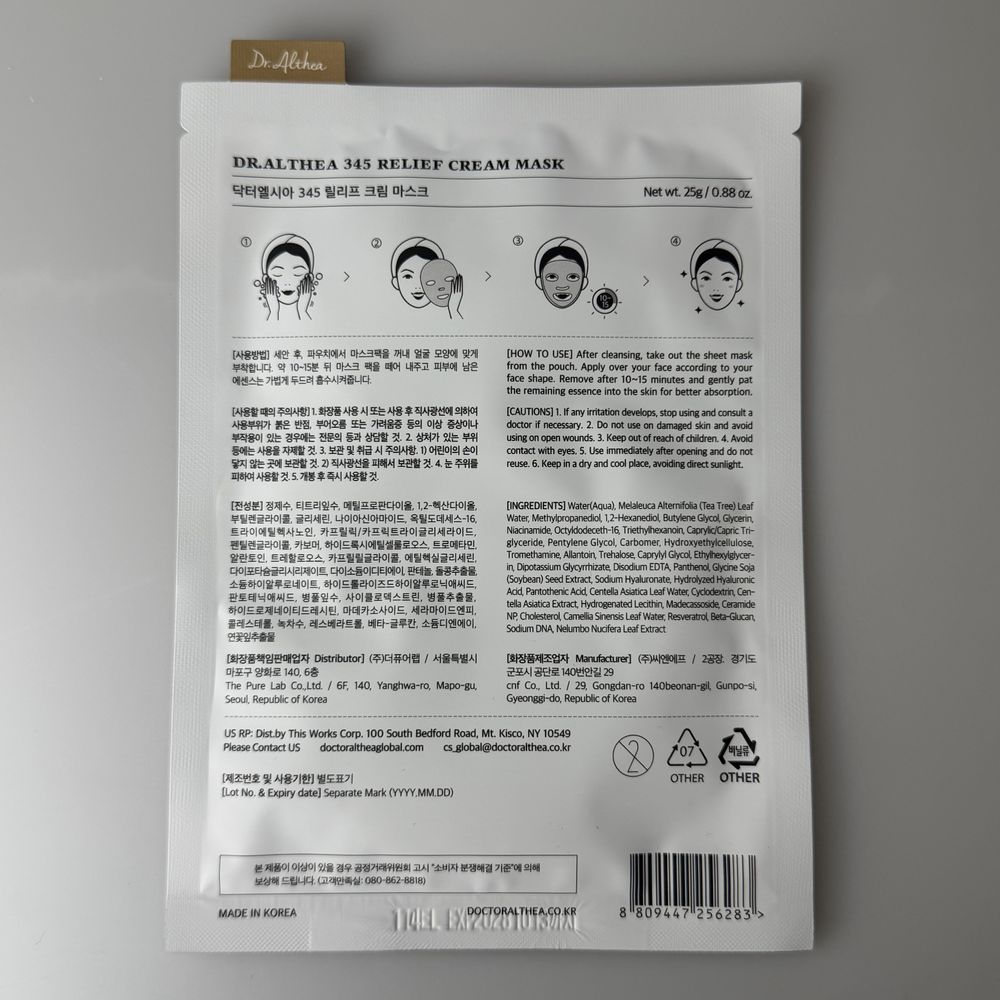 Восстанавливающая тканевая маска с успокаивающим эффектом для чувствительной, раздражённой и повреждённой кожи. Насыщенная густой кремовой эссенцией, маска плотно прилегает к коже, удерживает влагу и активные компоненты, помогая быстро уменьшить сухость и покраснение и восстановить комфорт кожи. DR ALTHEA 345 Relief Cream Mask помогает быстро восстановить кожу после пилингов и солнца, успокоить проявления постакне и укрепить ослабленный защитный барьер. Высококонцентрированная сбалансированная формула 3:4:5 обеспечивает комплексный уход, сочетая компоненты для уменьшения высыпаний, питания и успокоения кожи. Маска с высокой адгезией имеет основу из натуральной целлюлозы. Лекало маски само по себе плотно прилегает к коже, обеспечивая эффект компресса и эффективное проникновение полезных компонентов.