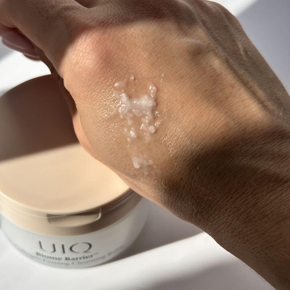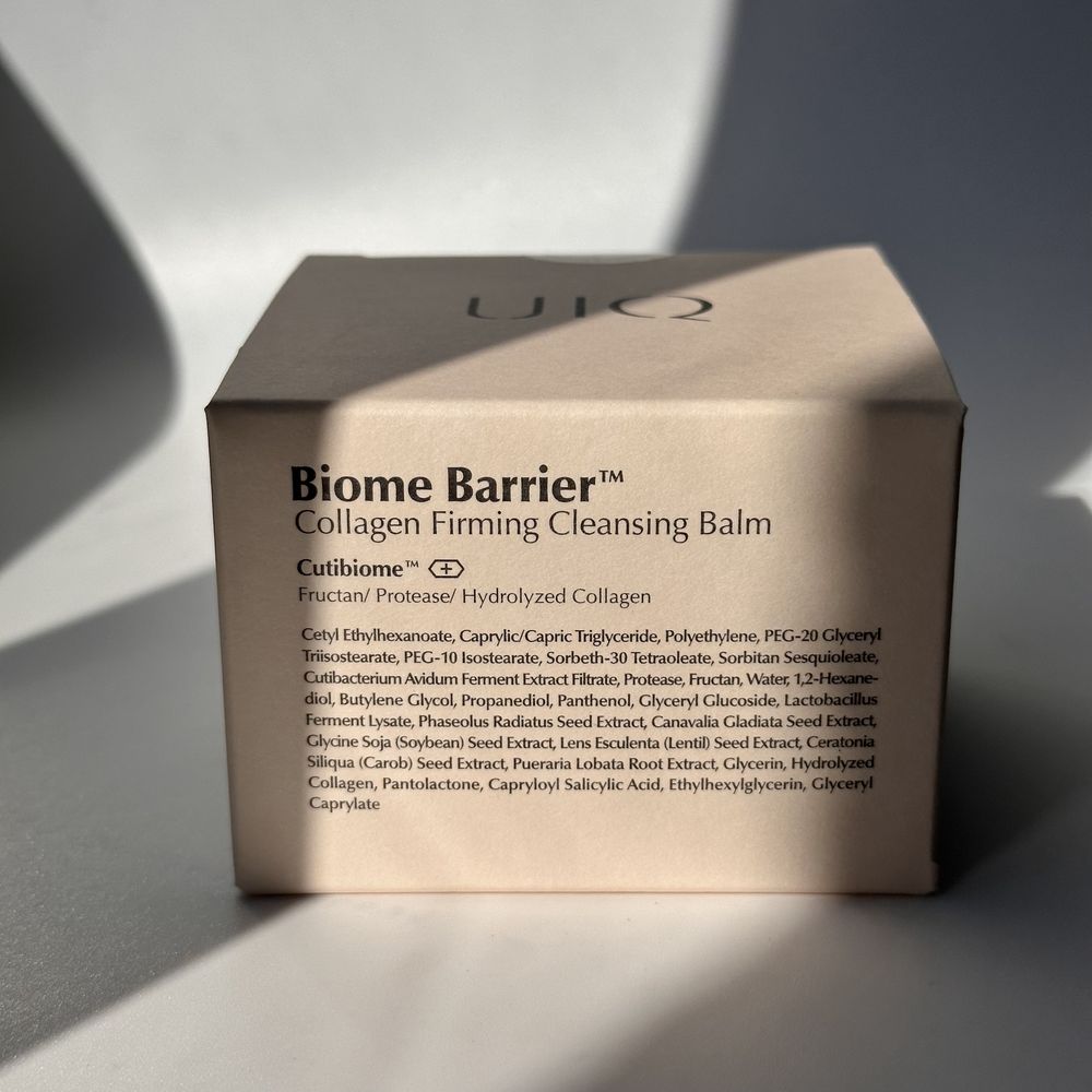 Глубокоочищающий бальзам активно растворяет средства солнцезащиты и макияжа, удаляет загрязнения с кожи, очищает поры и обеспечивает ощущение комфорта и чистоты. Помогает минимизировать чёрные точки и сальные нити, способствует сужению пор. Уникальная комбинация активных веществ легко удаляет излишек себума, очищая поры и предотвращая появление бактерий. Процесс очищения происходит мягко и деликатно, не вызывая обезвоживания, придавая ощущение комфорта за счёт содержания в составе пробиотиков и увлажняющих агентов. Продукт также помогает восстановить и укрепить эпидермальный барьер, обеспечивает подтягивающий эффект, повышая упругость и эластичность тканей. UIQ Biome Barrier Collagen Firming Cleansing Balm имеет текстуру нежного щербета, который мгновенно тает от тепла кожи, легко распределяется. С добавлением воды без затруднений эмульгируется и без проблем смывается. Прошел 9 пользовательских тестов, в частности, тест на гипоаллергенность.