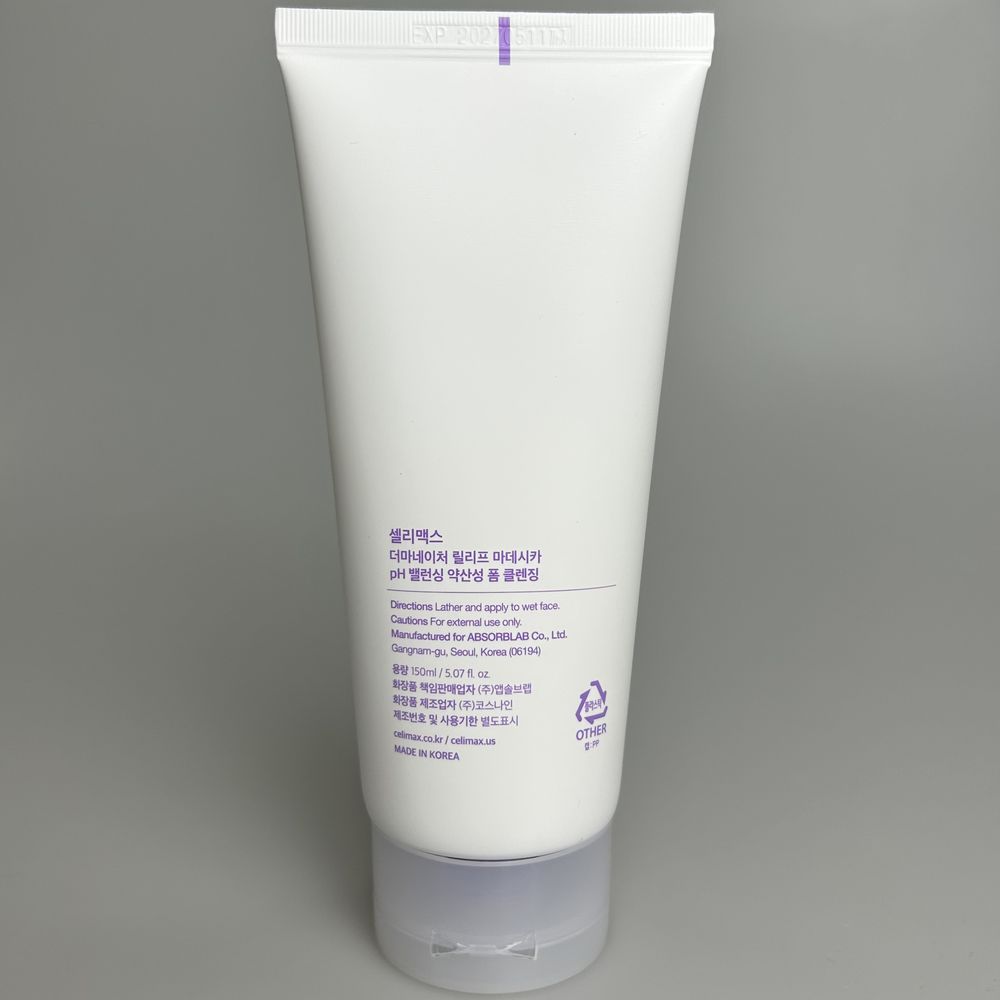 Эффективно и деликатно устраняет все виды загрязнений и остатки макияжа, при этом низкий уровень pH 5.5 не сушит и не стягивает кожу, не раздражает, помогает коже оставаться увлажнённой. Celimax Derma Nature Relief Madecica pH Balancing Foam Cleansing имеет нежную кремообразную текстуру, которая легко взбивается в воздушную пенку. Состав средства безопасен, не содержит красителей и отдушек, имеет приятный аромат микса эфирных масел.