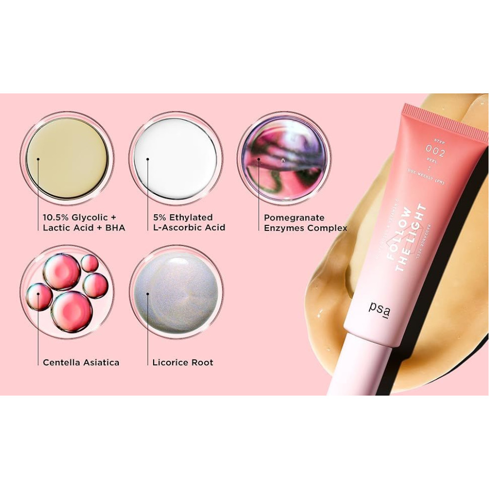 Пилинг с функциями антиоксиданта, восстанавливает кожу, предупреждает появление первых признаков возрастных изменений. Повышает защитные свойства кожи и сокращает ее несовершенства, в виде морщин, пигментации, пост акне, комедонов, черных точек, расширенных пор и неровного тона. Однофазный пилинг из AHA и BHA кислотами от PSA выравнивает тон, а также освежает и обеспечивает шелковистость коже лица.