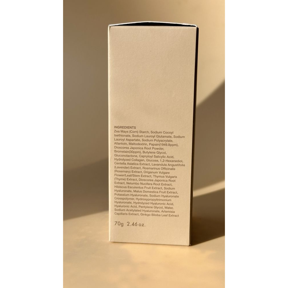 | Состав | Corn Starch, Sodium Cocoyl Isethionate, Sodium Lauroyl. Glutamate, Sodium Lauroyl Aspartate, Sodium Polyacrylates, Allantoin, Maltodextrin, Papain (1949.8Ppm), Yam Root Powder, Bromelain (30Ppm), Butylene Glycol, Gluconolactone, Capryloyl Salicylic Acid. Hydrolyzed Collagen. Glucose. 1.2-Sandiol, Centella Asiatica Extract, Lavender Extract, Rosemary Extract, Oregano Flower/Leaf/Stem Extract, Thyme Extract, Yam Root Extract, Lotus Root Extract, Okra Fruit Extract, Sodium Hyaluronate, Apple Extract, Potassium High Aluronate, Sodium Hyaluronate Crosspolymer, Hydroxypropyl Trimonium Hyaluronate, Hydrolyzed Hyaluronic Acid, Hyaluronic Acid, Pentylene Glycol, Purified Water, Sodium Acetylate Hyaluronate, Mugwort Extract, Ginkgo Leaf Extract Указанный состав является ознакомительным и может быть не точнымо по разным причинам (изменение состава производителем, ошибки при наполнении сайта и прочее). Точный состав смотрите на этикетке или упаковке средства. |