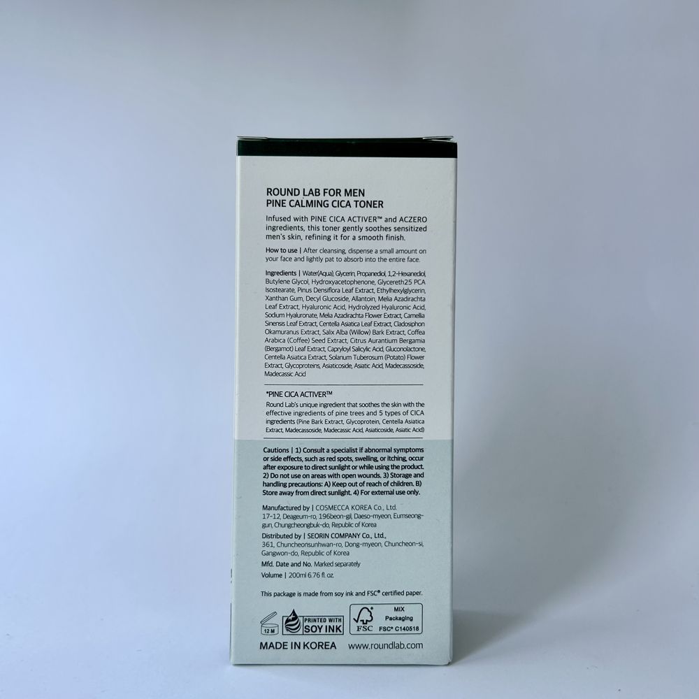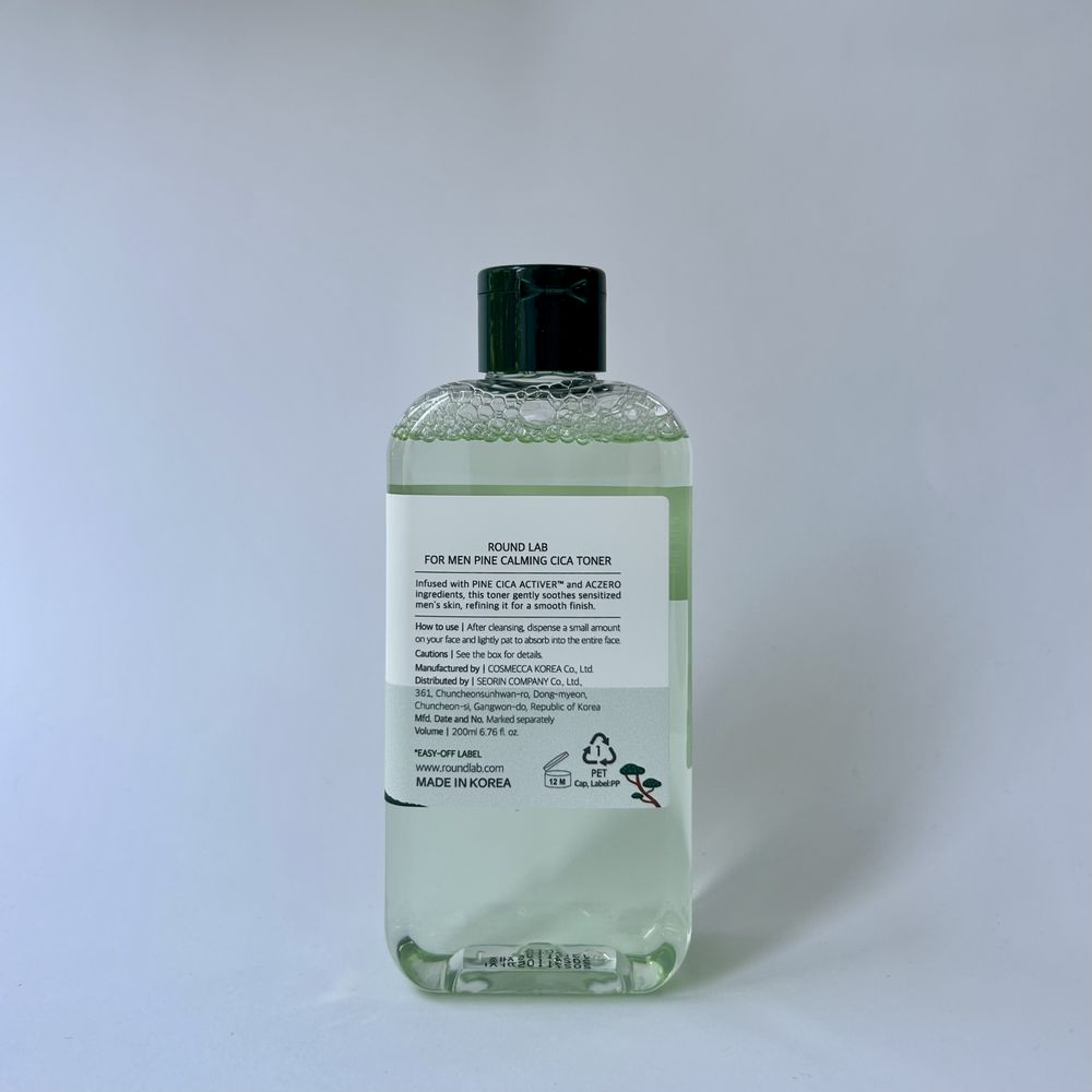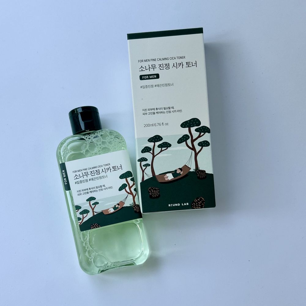 Тонер с экстрактом сосновых иголок и центеллы азиатской увлажняет и успокаивает кожу. Идеально подходит для мужской кожи: помогает успокоить раздражения, смягчает и способствует восстановлению после бритья. Содержит противовоспалительные компоненты, которые уменьшают высыпания и чёрные точки, а также контролируют выработку себума. Формула некомедогенна, слабокислый уровень pH 4–6, восстанавливает естественный баланс кожи и обеспечивает комфорт даже при повышенной чувствительности. Водянистая, невесомая текстура быстро впитывается и оставляет ощущение свежести. Round Lab — Pine Calming Cica является гипоаллергенным, клинически подтверждено Dermatest (Германия), подходит для чувствительной, реактивной кожи.