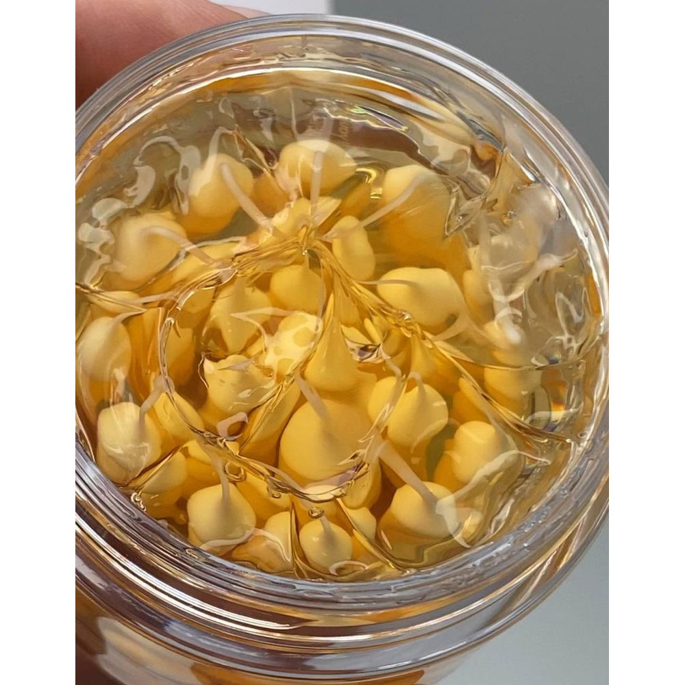 Средство представляет собой золотые кремовые шарики-капсулы в количестве 57 штук, которые находятся в окружение лёгкого геля. 1 шарика вполне достаточно для 1 применения. Нежная гелевая текстура средства при смешивании с кремовой капсулой приобретает однородную текстуру, обеспечивая комфортное ощущение расслабления и свежести.