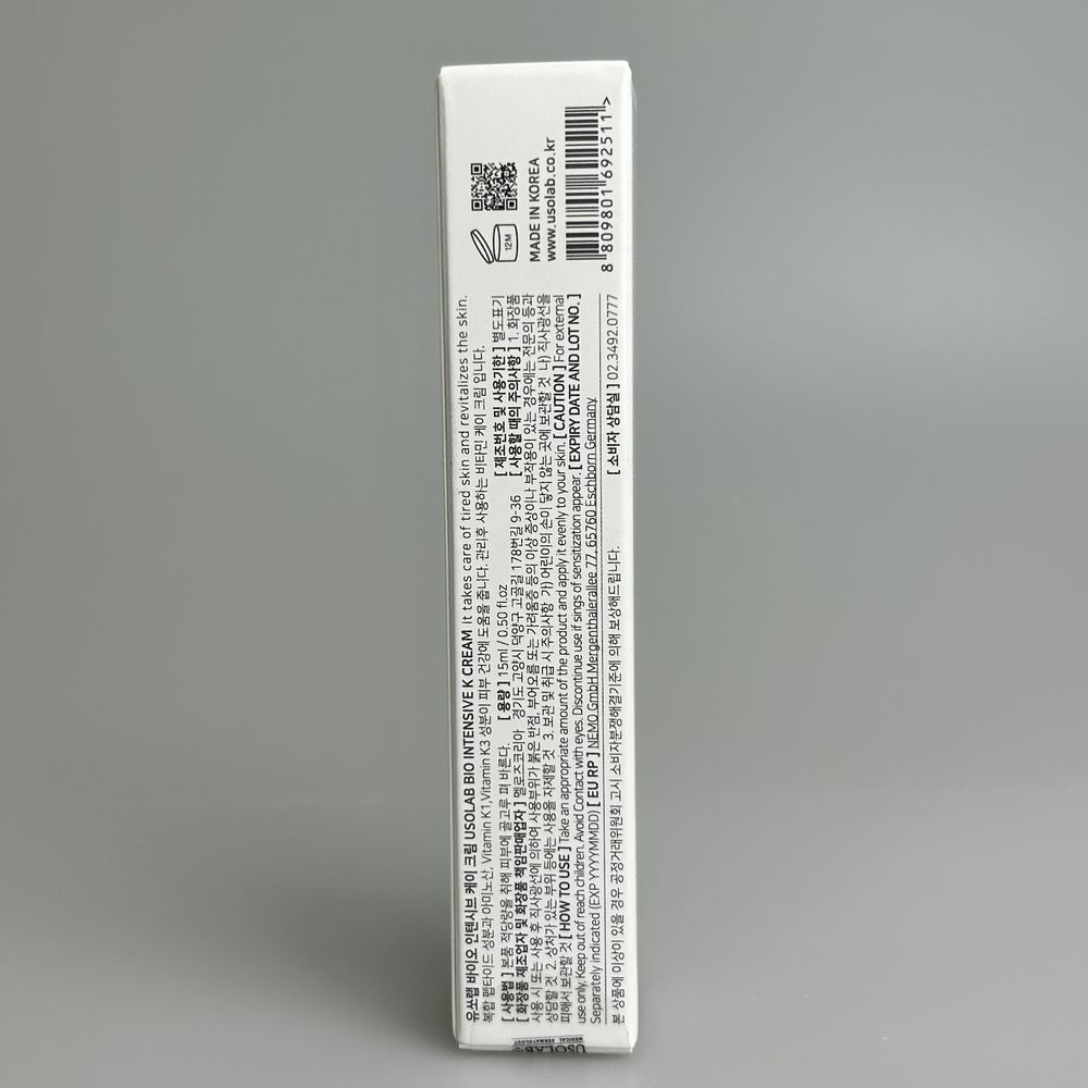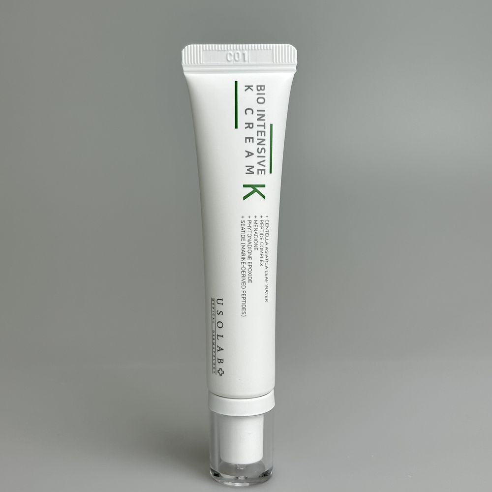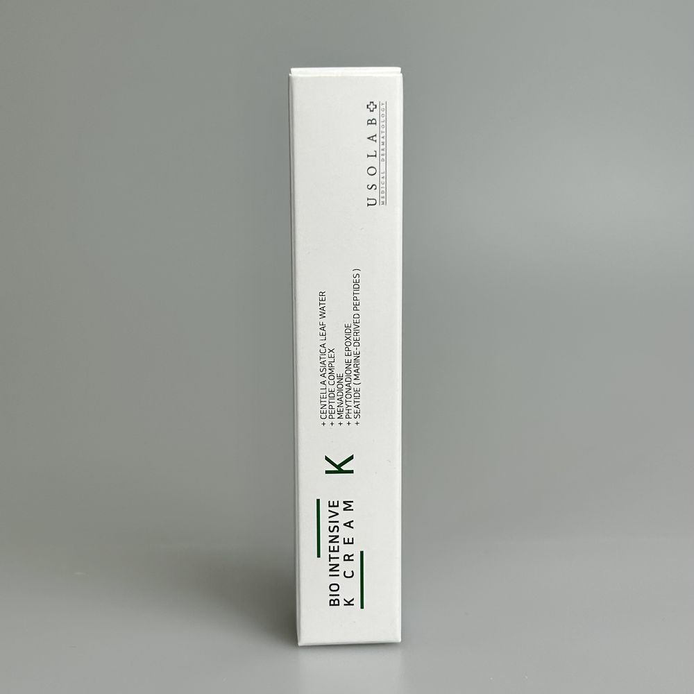 Уникальный крем для чувствительной хрупкой кожи, которая подвержена расширению капиллярных сосудов и покраснению. Обновленная формула на основе двух форм витамина К (Menadione и Phytonadione Epoxide), которые являются мощным орудием в борьбе с куперозом. Препарат укрепляет стенки сосудов, увлажняет кожу, защищает ее от преждевременного старения и раздражений внешней среды. В результате усиливается естественный кожный барьер и защита кожи, снижается гиперчувствительность и раздражение. В то же время средство активно увлажняет, питает и омолаживает кожу. USOLAB Bio Intensive K Cream уменьшает гиперемию и гематомы после операций, инъекционных процедур, коагуляции телеангиэктазий (сосудистых звёздочек), лазерного и химического пилинга. Можно использовать для борьбы с тёмными кругами, отёками под глазами.