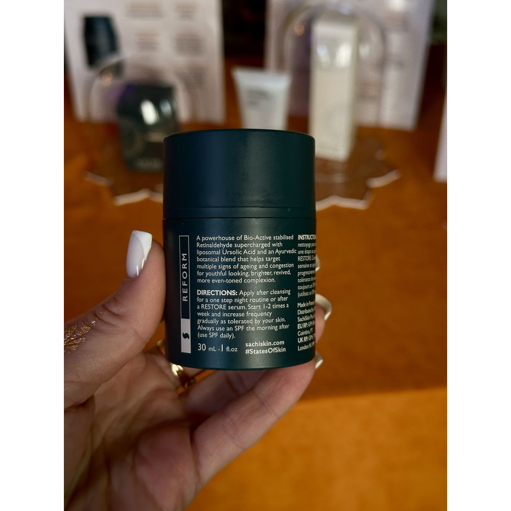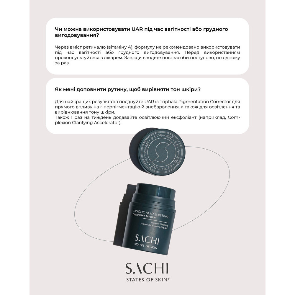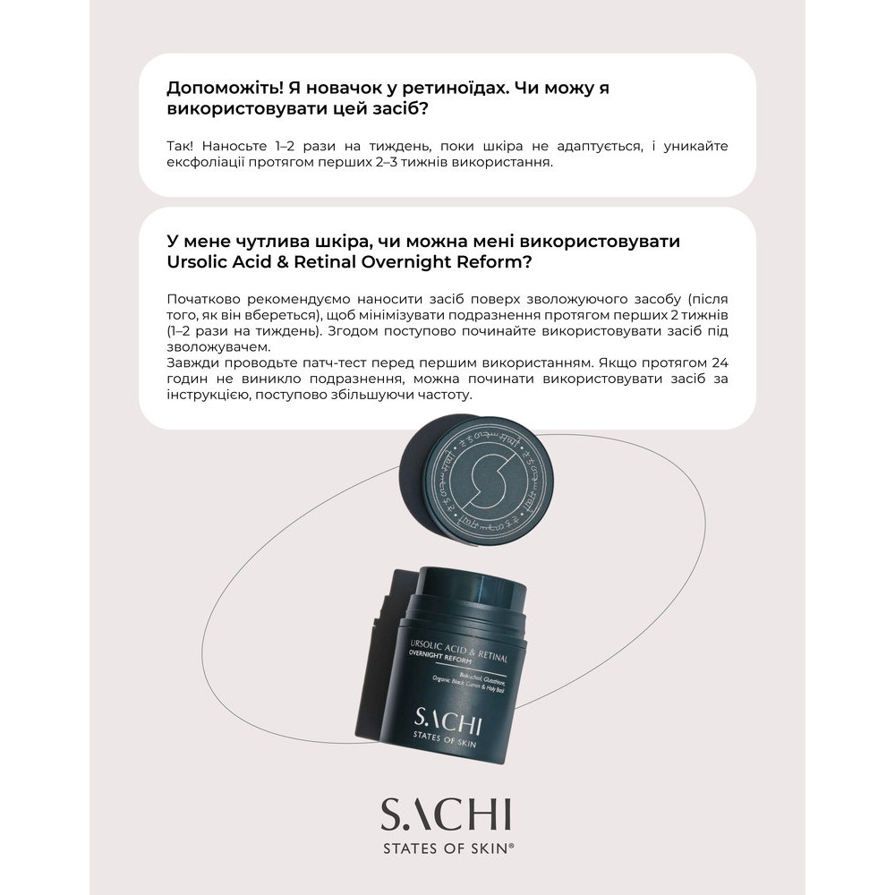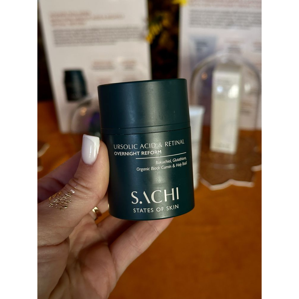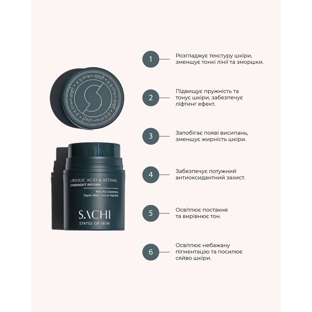 Ночной гель-крем возвращает коже гладкость, молодость и здоровый вид. SACHI Ursolic Acid & Retinal Overnight Reform содержит запатентованную смесь инкапсулированного ретинальдегида, липосомальной урсоловой кислоты и восстанавливающего трипептида, что обеспечивает средству мощное действие и многофункциональность. Крем одновременно способствует ускорению регенерации, выработке коллагена и эластина, улучшает клеточный обмен, борется с преждевременным старением, а также помогает устранить гиперпигментацию, тусклость, постакне и последствия солнечных повреждений. Содержание 12 антиоксидантов способствует улучшению тона и цвета кожи и обеспечивает защиту от воздействия свободных радикалов. Использование 3 технологий инкапсуляции повышает стабильность, эффективность и доставку активных ингредиентов, обеспечивая их глубокое проникновение и постепенное высвобождение. Видимый результат в виде гладкой, яркой и упругой кожи можно достичь всего за 28 дней регулярного использования этой совершенной антивозрастной формулы. Обладает лёгкой гелевой текстурой, легко наносится и хорошо впитывается кожей. Средство действует мягко и эффективно, минимизируя риск раздражения. Из-за содержания ретиналя не рекомендуется применять во время беременности и грудного вскармливания.