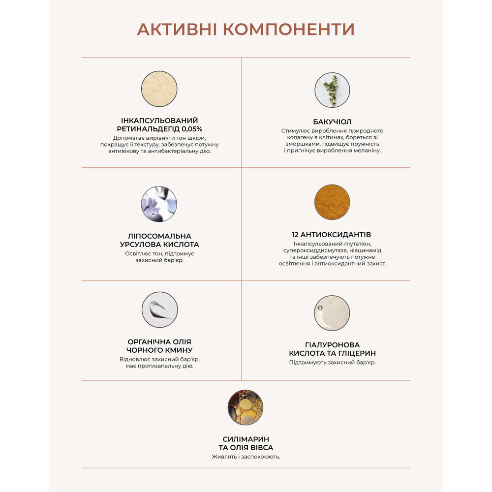 | Активные ингредиенты | Ретинол, Бакучиол, Глутатион, Растительные экстракты |