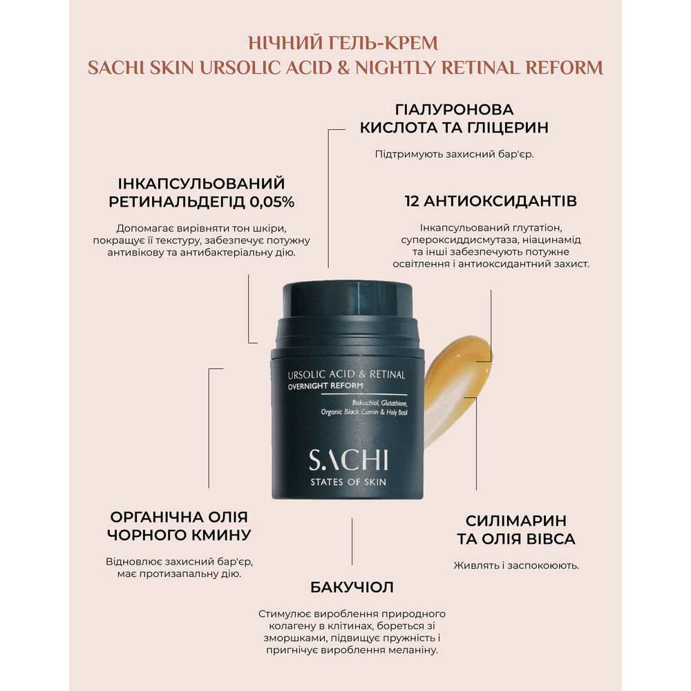 Обновляющий гель-крем с ретиналем и урсоловой кислотой SACHI Ursolic Acid & Retinal Overnight Reform - 30 мл