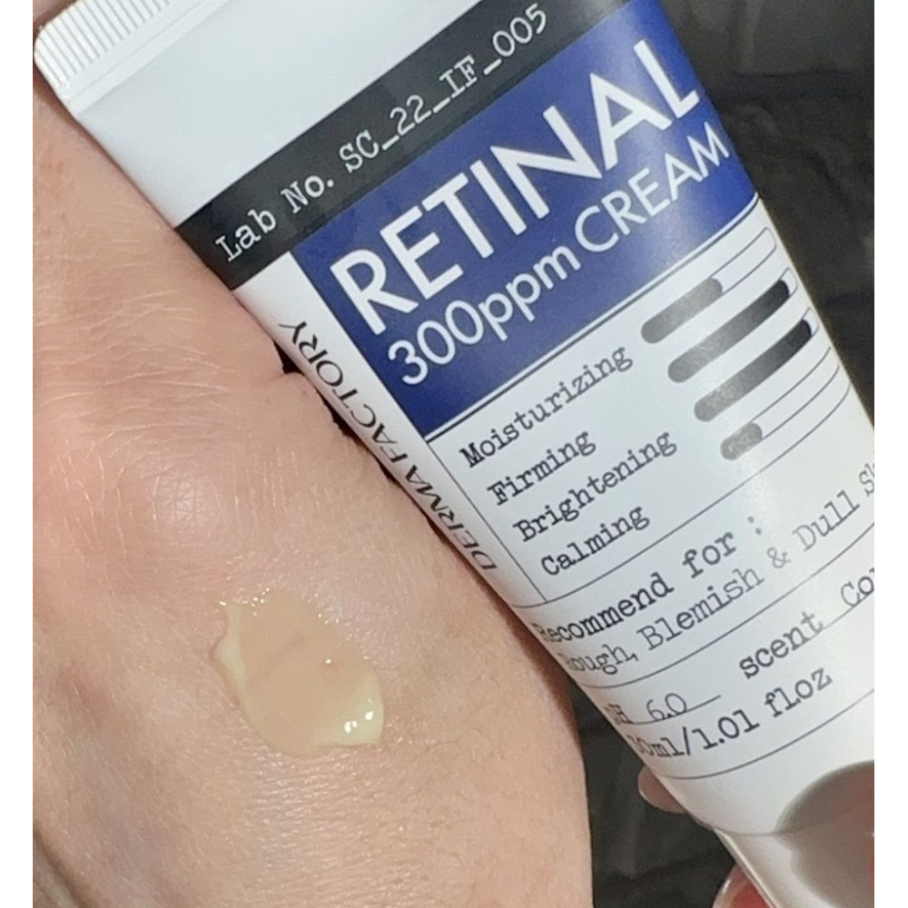 Крем с содержанием липосомального ретиналя в концентрации 0.03% для обновления и омоложения кожи. Он предназначен для того, чтобы придать коже более молодой вид, выровнять текстуру и тон. Этот крем является универсальным продуктом, который безусловно улучшает состояние мелких и глубоких морщин всего за четыре недели, а также разглаживает грубую кожу. Особая форма витамина А в составе обеспечивает антибактериальное действие и препятствует возникновению воспалений и угревой сыпи. Формула крема обогащена пантенолом и центеллой азиатской, которые совместно действуют, чтобы быстро успокоить кожу и снизить ее раздражение. Увлажняющие и барьерные составляющие помогают задерживать влагу, не позволяя ей пересушиваться, придают упругости, стимулируют регенерацию клеток. DERMA FACTORY Retinal 300ppm Cream отлично подходит в качестве первого этапа ретиноидной терапии. Крем имеет консистенцию средней плотности, достаточно хорошо поглощается кожей.