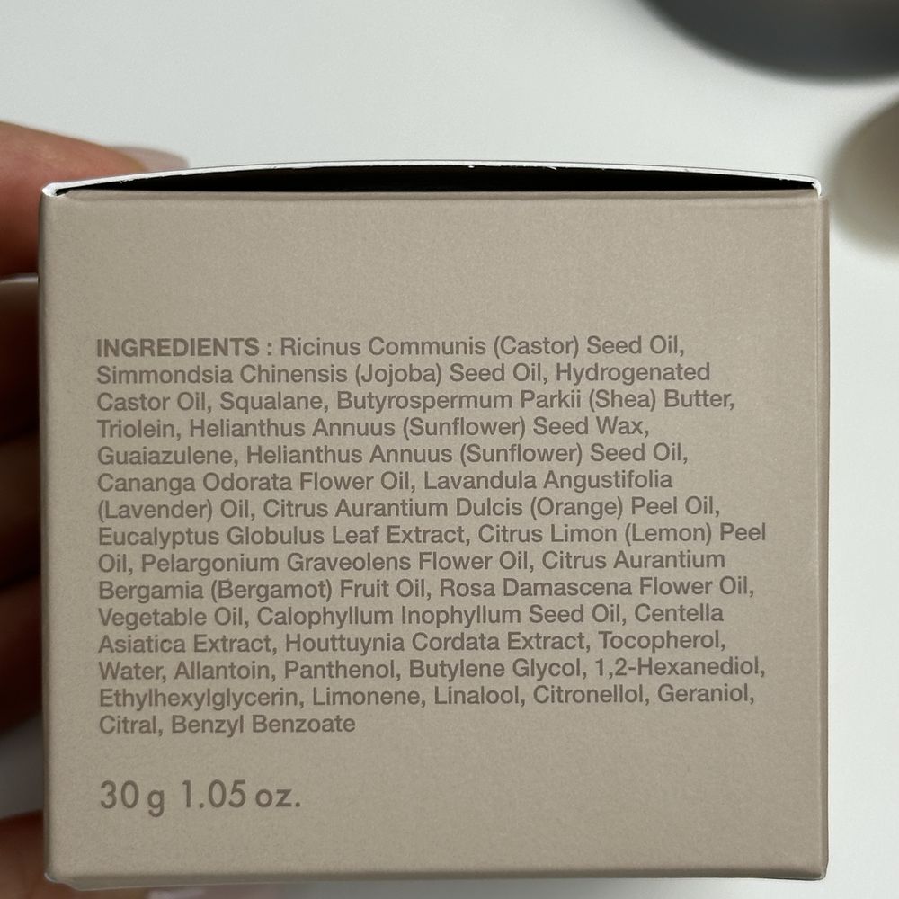 | Состав | Castor Seed Oil, Jojoba Seed Oil, Hydrogenated Castor Oil, Squalane (100,000 ppm), Shea Butter, Triolein, Sunflower Seed Wax, Guai Azulene (1,000 ppm), Sunflower Seed Oil, Ylang-Ylang Flower Oil, Lavender Oil, Orange Peel Oil, Eucalyptus Leaf Extract, Lemon Peel Oil, Scented Geranium Flower Oil, Bergamot Oil, Damask Rose Flower Oil, Plant-based Oil, Macadamia Seed Oil, Centella Asiatica Extract, Houttuynia Cordata Extract, Tocopherol, Purified Water, Allantoin, Panthenol, Butylene Glycol, 1,2-Hexanediol, Ethylhexylglycerin, Limonene, Linalool, Citronellol, Geraniol, Citral, Benzyl Benzoate Указанный состав является ознакомительным и может быть не точнымо по разным причинам (изменение состава производителем, ошибки при наполнении сайта и прочее). Точный состав смотрите на этикетке или упаковке средства. |