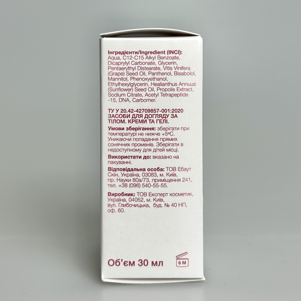 | Состав | Aqua, C12-C15 Alkyl Benzoate, Dicaprylyl Carbonate, Glycerin, Pentaerythyl Distearate, Vitis Vinifera (Grape) Seed Oil, Panthenol, Bisabolol, Mannitol, Phenoxyethanol, Ethylhexylglycerin, Helianthus Annuus (Sunflower) Seed Oil, Propolis Extract, Sodium Citrate, Acetyl Tetrapeptide-15, DNA, Carbomer Указанный состав является ознакомительным и может быть не точнымо по разным причинам (изменение состава производителем, ошибки при наполнении сайта и прочее). Точный состав смотрите на этикетке или упаковке средства. |