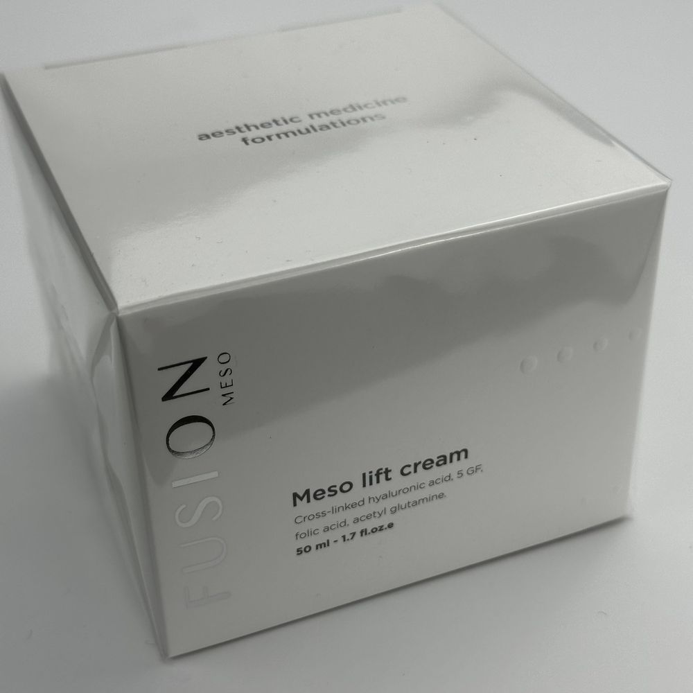 Лифтинг-крем, обогащенный компонентами с эстетической медицины, результативно и стойко помогает бороться с дефектами кожи, связанные со старением и потерей упругости. Сшитая гиалуроновая кислота в составе Fusion Meso Lift Cream действует подобно филлерам, заполняя глубокие дермальные морщины. Омолаживающий, реструктуризирующий дерму комплекс, который богат факторами роста, витамином B9 и ацетил глутамином, действует аналогично плацентарной терапии, стимулирует клеточную активность и побуждает фибробласты к выработке коллагена. Крем помогает в комплексной борьбе против старения, разглаживая мимические и глубокие морщины, подтягивая овал лица. Помогает уменьшить появление морщин, одновременно улучшая эластичность кожи и восполняя гидрорезерв. Текстура средства невероятно нежная, оставляет нежный финиш, и кожа становится будто шелк. Регулярно используя крем, после 2 недель уменьшается глубина морщин на 38%, а увлажненность кожи в свою очередь повышается на 50%.