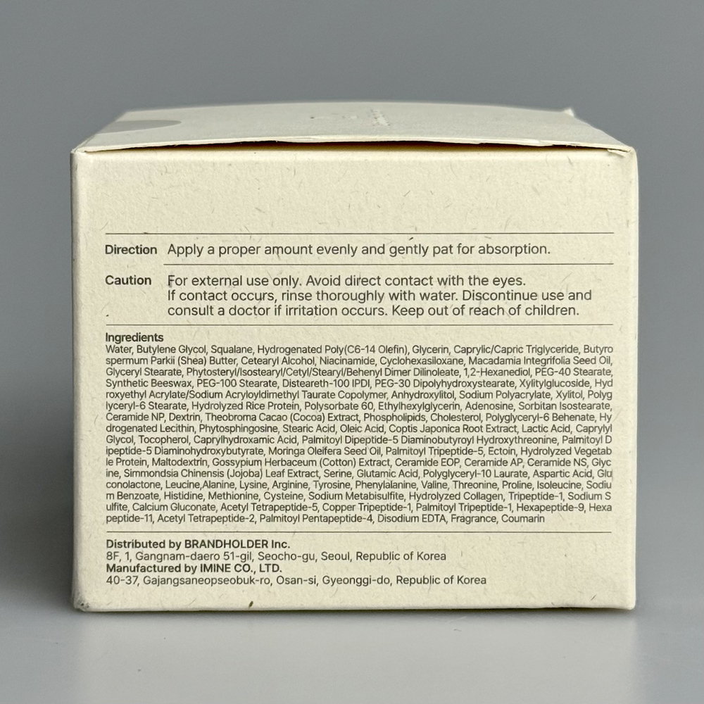 | Состав | Hydrolyzed Rice Protein, Butylene Glycol, Squalane, Hydrogenated Poly (C6-14 Olefin), Caprylic/Capric Triglyceride, Shea Butter, Glycerin, Cetearyl Alcohol, Niacinamide, Queensland Nut Oil, Cyclohexasiloxane, Glyceryl Stearate, Phytosteryl/Isostearyl/Cetyl/Stearyl/Behenyl Dimer Dilinoleate, PEG-40 Stearate, Synthetic Beeswax, Purified Water, PEG-100 Stearate, Disteareth-100 I.P.I., PEG-30 Dipolyhydroxystearate, Xylityl Glucoside, Hydroxyethyl Acrylate/Sodium Acryloyldimethyl Taurate Copolymer, Anhydroxylitol, Xylitol, Polyglyceryl-6 stearate, sodium polyacrylate, polysorbate 60, ethylhexylglycerin, adenosine, glucose, sorbitan isostearate, ceramide NP, dextrin, cocoa extract, phospholipid, cholesterol, polyglyceryl-6 behenate, hydrogenated lecithin, phytosphingosine, 1,2-hexanediol, stearic acid, oleic acid, coptis root extract, lactic acid, caprylyl glycol, caprylhydroxamic acid, palmitoyl dipeptide-5 diaminobutyloyl hydroxythreonine, palmitoyl dipeptide-5 diaminohydroxybutyrate, drumstick seed oil, palmitoyl tripeptide-5, ectoin, maltodextrin, Hydrolyzed vegetable protein, cotton extract, ceramide NS, ceramide EOP, ceramide AP, glycine, jojoba leaf extract, serine, glutamic acid, polyglyceryl-10 laurate, aspartic acid, gluconolactone, leucine, alanine, lysine, arginine, tyrosine, phenylalanine, threonine, proline, valine, isoleucine, sodium benzoate, histidine, methionine, cysteine, sodium metabisulfite, hydrolyzed collagen, tripeptide-1, sodium sulfite, calcium gluconate, acetyl tetrapeptide-2, acetyl tetrapeptide-5, copper tripeptide-1, palmitoyl tripeptide-1, palmitoyl pentapeptide-4, Hexapeptide-11, Hexapeptide-9, Disodium EDTA, Fragrance, Coumarin Указанный состав является ознакомительным и может быть не точнымо по разным причинам (изменение состава производителем, ошибки при наполнении сайта и прочее). Точный состав смотрите на этикетке или упаковке средства. |
