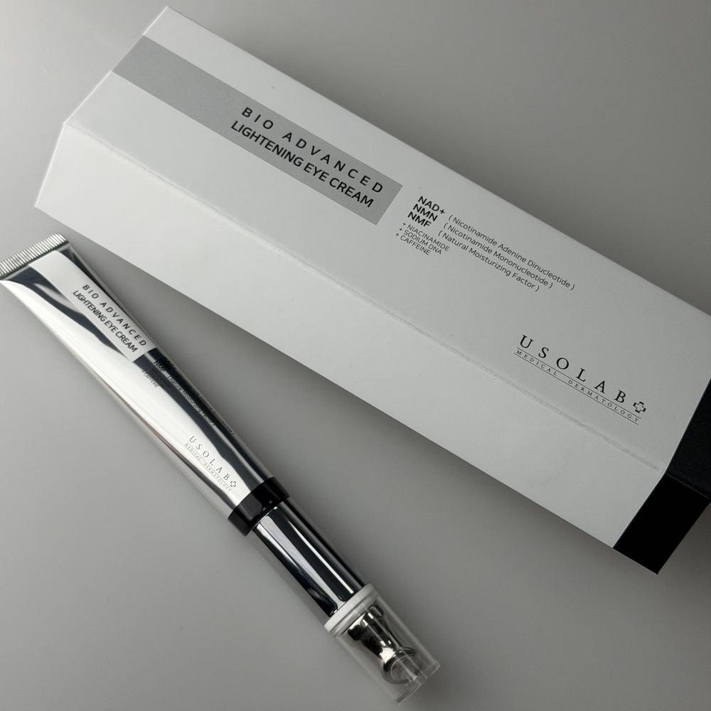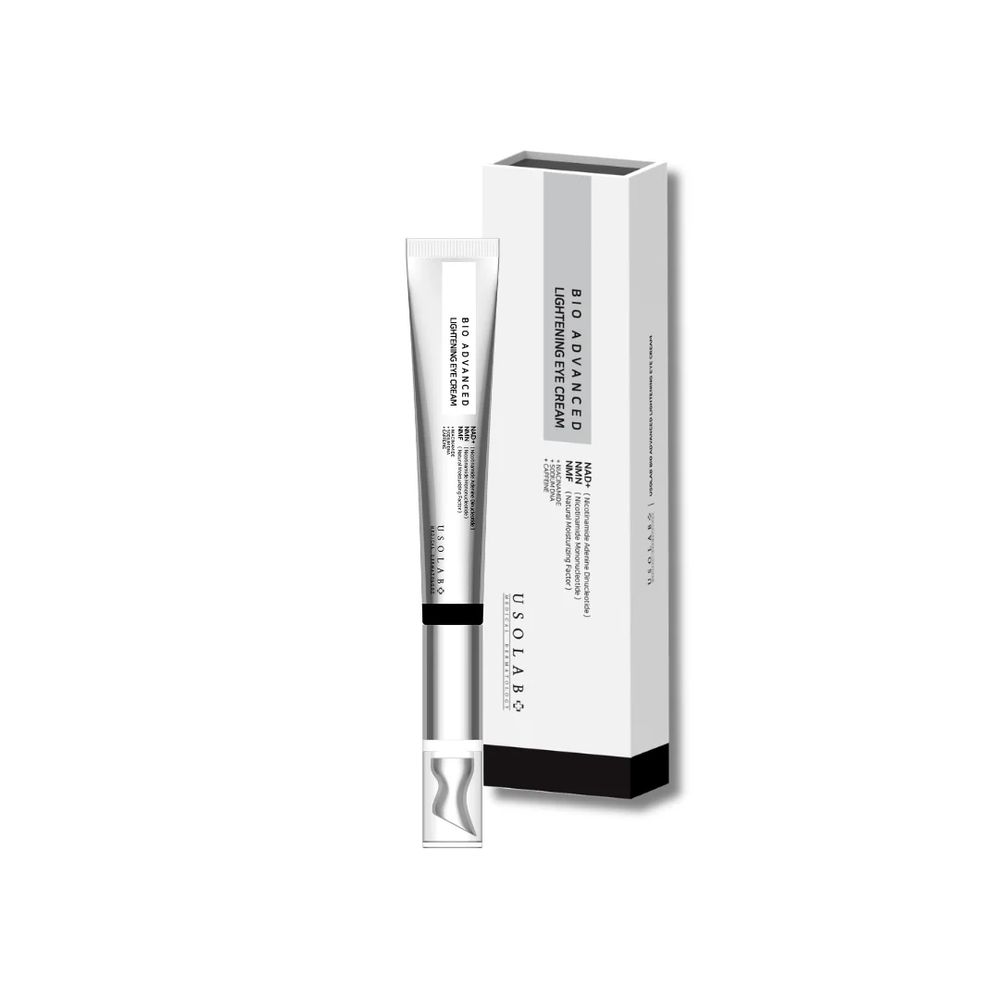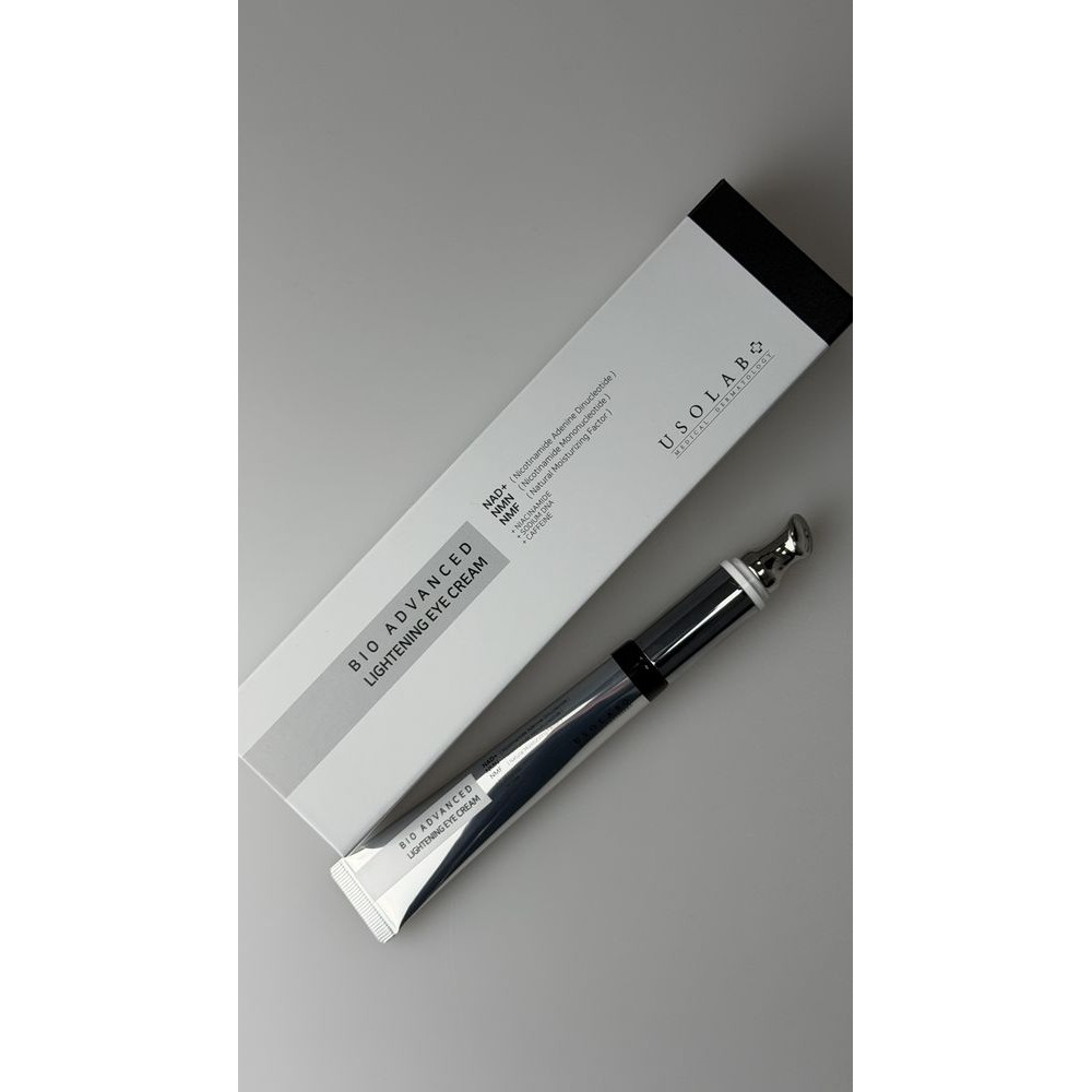 Осветляющий крем для зоны вокруг глаз обеспечивает интенсивное увлажнение, помогает уменьшить выраженность тёмных кругов и отёчности, делает взгляд более свежим и отдохнувшим. Средство направлено на улучшение тона кожи, уменьшение проявлений усталости и поддержание упругости деликатной зоны. Благодаря кофеину улучшается микроциркуляция, а ниацинамид способствует осветлению и выравниванию тона. Обновлённая формула сочетает современный anti-age подход и деликатный ежедневный уход. В состав добавлены современные компоненты - NAD+ и NMN, которые поддерживают клеточную энергию и антивозрастные процессы на уровне кожи. Комплекс пептидов в сочетании с Sodium DNA, центеллой, пантенолом и тремеллой помогает поддерживать упругость, уменьшать проявления мимических морщин и укреплять защитный барьер. Формула сбалансирована и комфортна для ежедневного использования, оптимизированное количество растительных экстрактов минимизирует риск раздражения чувствительной зоны. Крем глубоко увлажняет, поддерживает регенерацию, улучшает текстуру кожи и способствует её более гладкому, сияющему виду. Металлический аппликатор обеспечивает равномерное нанесение, приятно охлаждает и усиливает лимфодренажный эффект, помогая быстрее уменьшить отёки. Благодаря USOLAB Bio Advanced Lightening Eye Cream кожа вокруг глаз выглядит более ухоженной, свежей и визуально осветлённой.