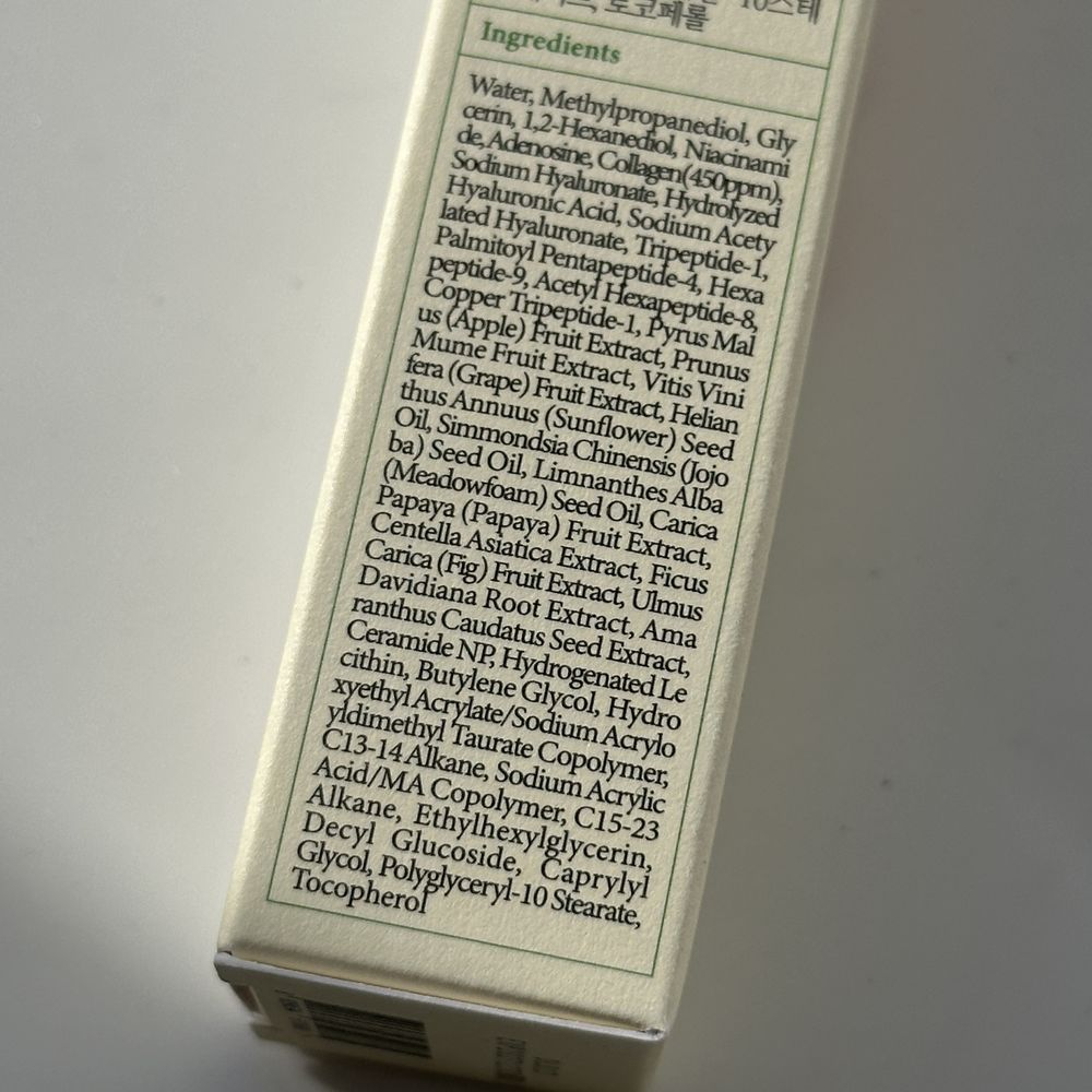 | Состав | Water, Methylpropanediol, Glycerin, 1,2-Hexanediol, Niacinamide, Butylene Glycol, Hydroxyethyl Acrylate/sodium Acryloyldimethyl Taurate Copolymer, C13-14 Alkane, Sodium Acrylic Acid/MA Copolymer, C15-23 Alkane, Ethylhexylglycerin, Collagen, Adenosine, Decyl Glucoside, Prunus Mume Fruit Extract, Limnanthes Alba (Meadowfoam) Seed Oil, Pyrus Malus (Apple) Fruit Extract, Carica Papaya (Papaya) Fruit Extract, Vitis Vinifera (Grape) Fruit Extract, Leuconostoc/Radish Root Ferment Filtrate, Hydrogenated Lecithin, Helianthus Annuus (Sunflower) Seed Oil, Simmondsia Chinensis (Jojoba) Seed Oil, Ulmus Davidiana Root Extract, Amaranthus Caudatus Seed Extract, Ficus Carica (Fig) Fruit Extract, Caprylyl Glycol, Centella Asiatica Extract, Polyglyceryl-10 Stearate, Ceramide NP, Sodium Hyaluronate, Tocopherol, Tripeptide-1, Palmitoyl Pentapeptide-4, Hydrolyzed Hyaluronic Acid, Hexapeptide-9, Copper Tripeptide-1, Acetyl Hexapeptide-8, Sodium Acetylated Hyaluronate Указанный состав является ознакомительным и может быть не точнымо по разным причинам (изменение состава производителем, ошибки при наполнении сайта и прочее). Точный состав смотрите на этикетке или упаковке средства. |
