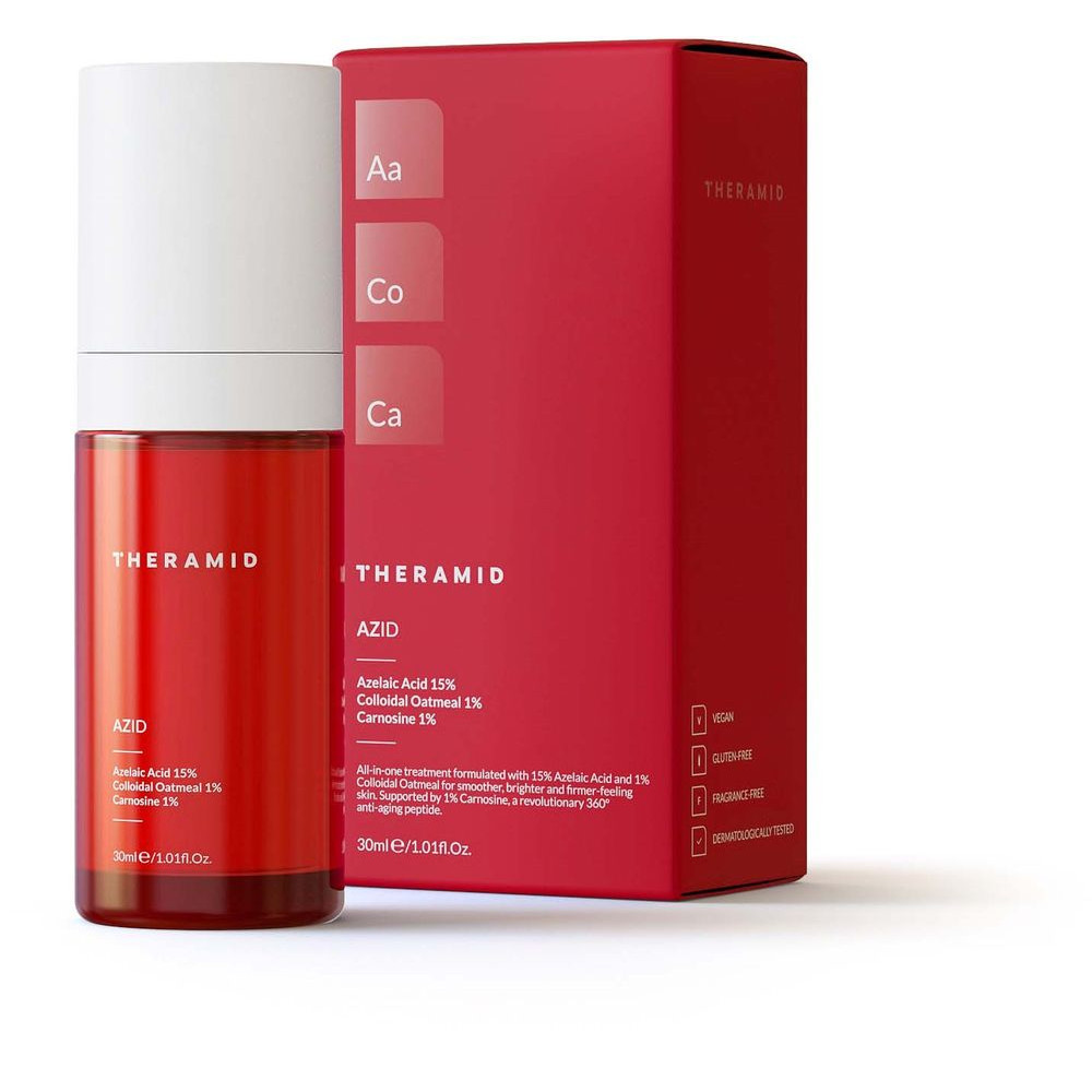 Сыворотка с азелаиновой кислотой для эффективного ухода за реактивной, склонной к покраснениям и проблемной кожей. Осветляет пигментацию, пост акне и другие проблемные пятна, выравнивает тон и текстуру. Снимает красноту и воспаления, устраняет чёрные точки, бережно отшелушивает омертвевшие клетки эпидермиса. Помогает контролировать выработку кожного сала и восстановить гидролипидный баланс, сужает поры. Theramid AZID 15% Azelaic Acid Treatment содержит дополнительные активы с антиоксидантными, увлажняющими и успокаивающими свойствами, которые минимизируют процессы повреждения и гликации, а также успокаивают зуд и восстанавливают защитный барьер. В результате использования серума кожа становится однородной, гладкой и сияющей. Средство имеет приятную текстуру эмульсии, хорошо распределяется по лицу и быстро впитывается. Удобная упаковка с дозатором делает нанесение легким, быстрым и гигиеническим.
