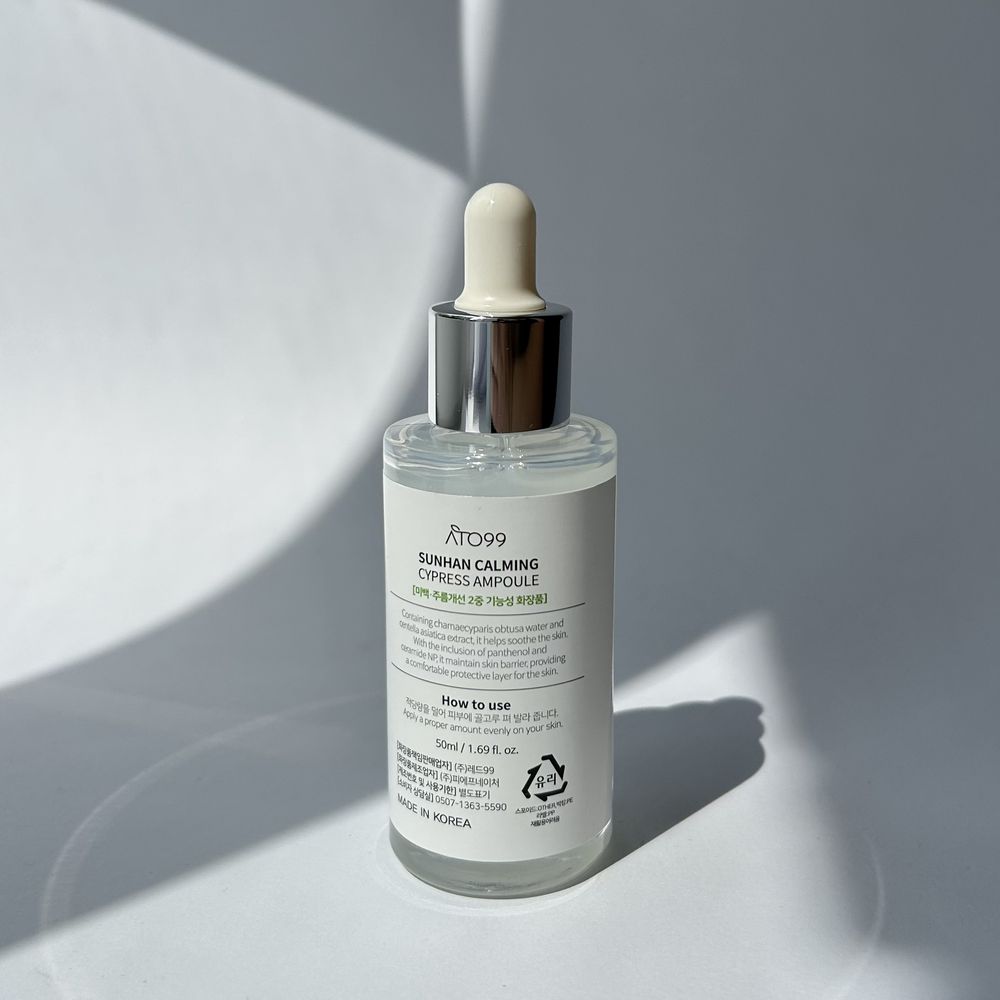 Успокаивающая ампула на основе экстрактов японского кипариса и центеллы азиатской для чувствительной, сухой и раздраженной кожи. Ампула оказывает успокаивающее, противовоспалительное и увлажняющее действие. В составе ATO99 Sunhan Calming Cypress Ampoule формула с 93% активов растительного происхождения без агрессивных компонентов. Синергия кипариса и центеллы оказывает двойной эффект: комплекс Cica успокаивает кожу, помогает восстановлению барьера, а кипарис увлажняет и укрепляет кожу. Ампула со слабокислым уровнем pH от 5.5 до 6.5, что соответствует естественному pH здоровой кожи и способствует укреплению защитного барьера. Средство не вызывает раздражения, подходит для чувствительной и сухой кожи. Имеет легкую текстуру и приятный натуральный, ненавязчивый аромат.