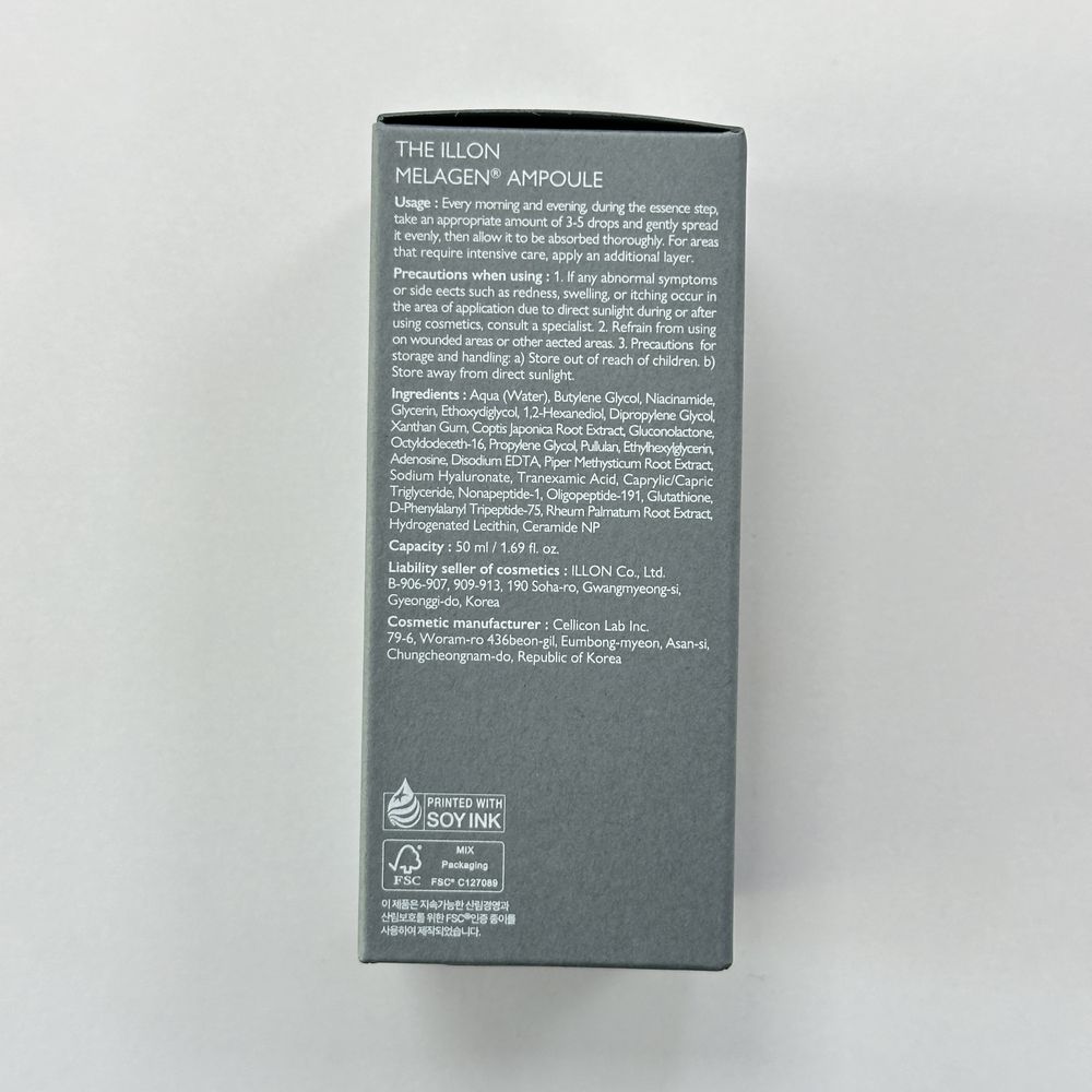 Осветляющая ампула премиум-уровня для яркого сияния кожи даже без фильтров. Профессиональная формула ингибирует синтез меланина, что напрямую помогает уменьшить существующую пигментацию (пятна, постакне, мелазму), выровнять тон и в целом сделать кожу светлее и сияющей. Инновационная технология доставки активных компонентов DermiShuttle™ обеспечивает стимуляцию кожи и доставку активных веществ в дерму без чрезмерной травматизации. В составе THE iLLON Melagen Ampoule содержится запатентованный ингредиент Demelaxyl™, который демонстрирует наивысшую эффективность в подавлении меланогенеза, улучшает состояние тусклой, пигментированной и возрастной кожи.