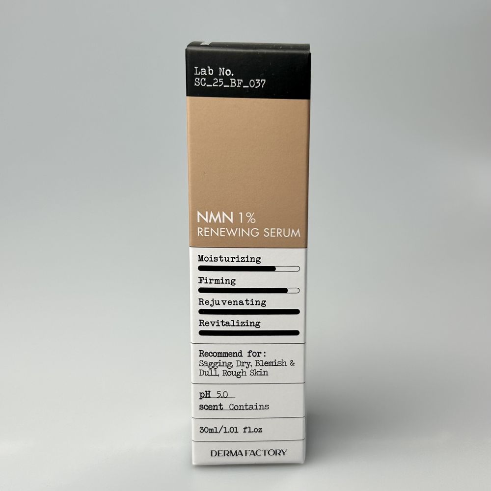 Сыворотка для обновления и омоложения кожи содержит инновационные антивозрастные активы: 1% NMN, 0,1% NAD+ и ресвератрол. NMN и NAD+ являются компонентами «долголетия», которые предотвращают старение кожи, улучшая её способность к обновлению и регенерации. Использование DERMA FACTORY NMN 1% Renewing Serum стимулирует процесс омоложения кожи на клеточном уровне, повышает энергетическую активность клеток, улучшает текстуру кожи и уменьшает признаки старения.