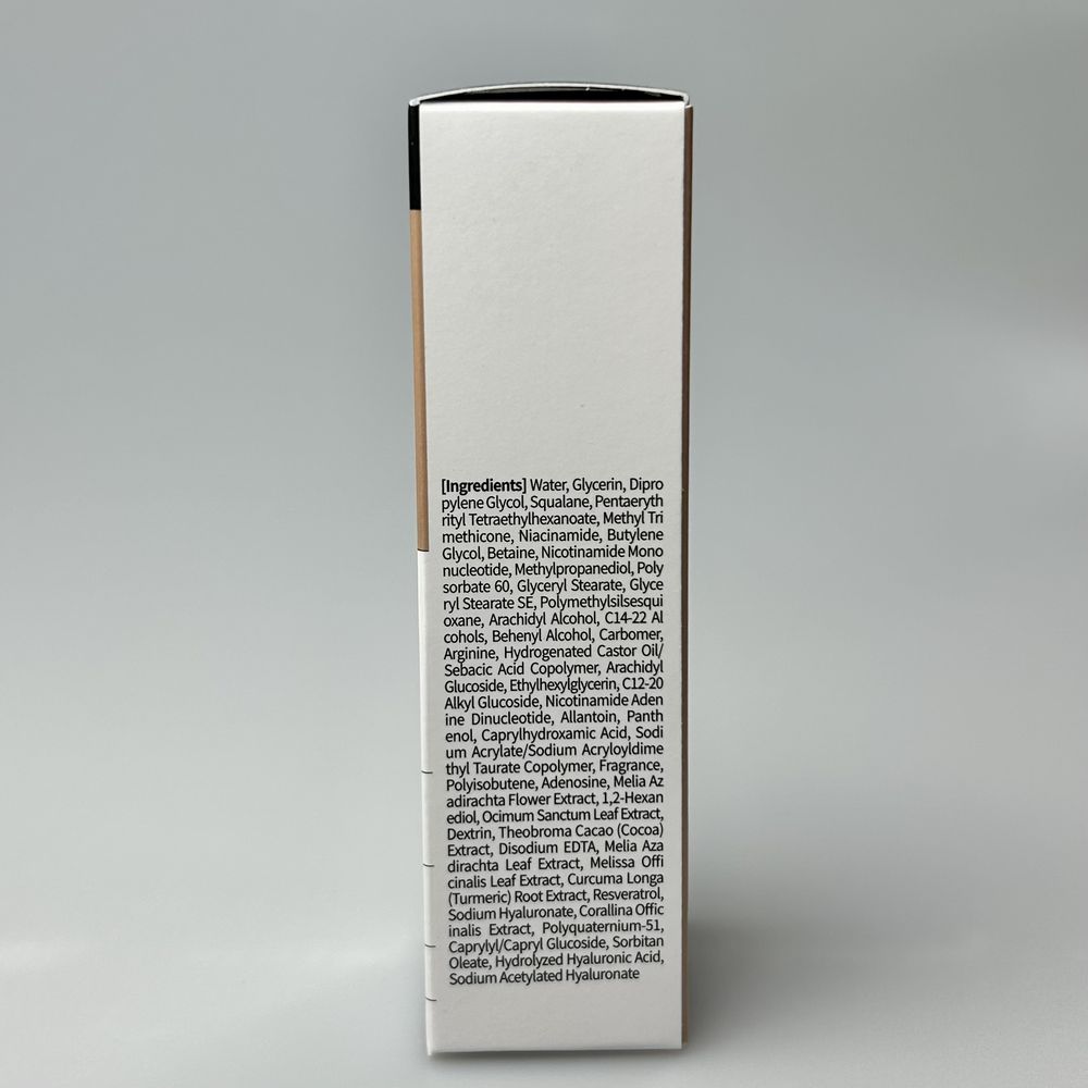 | Состав | Purified Water, Glycerin, Dipropylene Glycol, Squalane, Pentaerythrityl Tetraethylhexanoate, Methyl Trimethicone, Niacinamide, Butylene Glycol, Betaine, Nicotinamide Mononucleotide, Methylpropanediol, Glyceryl Stearate, Glyceryl Stearate SE, Polymethylsilsesquioxane, Arachidyl Alcohol, C14-22 Alcohols, Behenyl Alcohol, Carbomer, Arginine, Hydrogenated Castor Oil/Sebacic Acid Copolymer, Arachidyl Glucoside, Ethylhexylglycerin, C12-20 Alkyl Glucoside, Nicotinamide Adenine Dinucleotide, Allantoin, Panthenol, Caprylhydroxamic Acid, Sodium Acrylate/Sodium Acryloyldimethyl Taurate Copolymer, Perfume, Polyisobutene, Adenosine, Melia Azadirachta Flower Extract, 1,2-Hexanediol, Ocimum Sanctum Leaf Extract, Dextrin, Theobroma Cacao (Cocoa) Extract, Disodium EDTA, Melissa Officinalis Leaf Extract, Curcuma Longa (Turmeric) Root Extract, Resveratrol, Sodium Hyaluronate, Coralina Officinalis Extract, Polyquaternium-51, Caprylyl/Capryl Glucoside, Sorbitan Oleate, Hydrolyzed Hyaluronic Acid, Sodium Acetylated Hyaluronate Указанный состав является ознакомительным и может быть не точнымо по разным причинам (изменение состава производителем, ошибки при наполнении сайта и прочее). Точный состав смотрите на этикетке или упаковке средства. |
