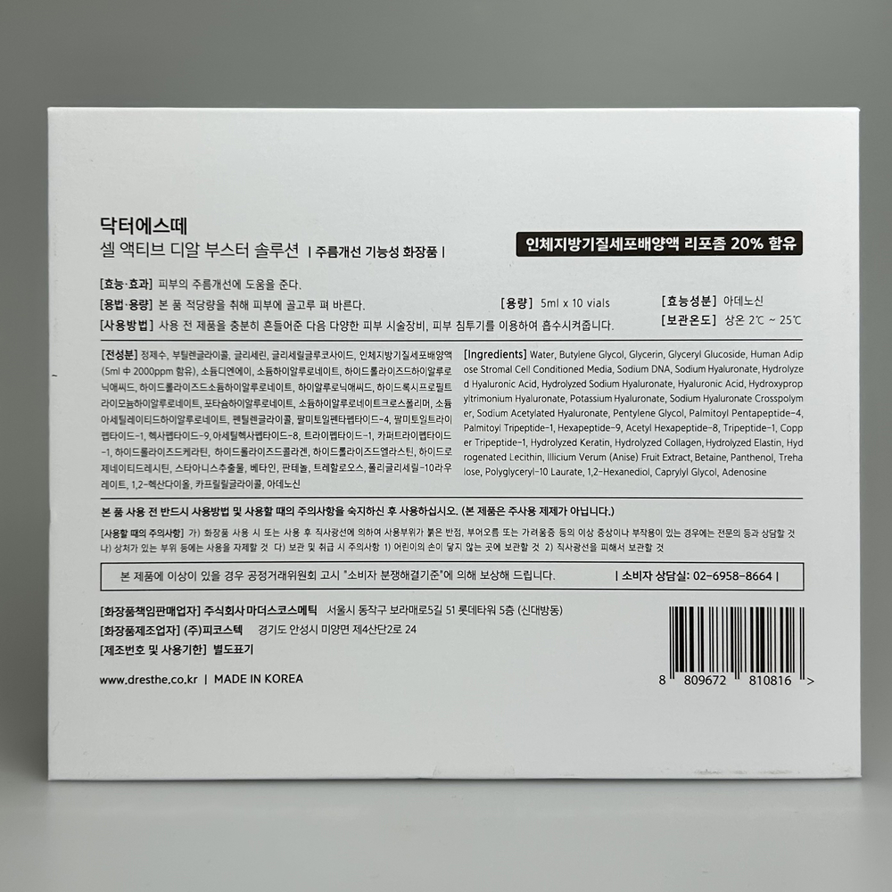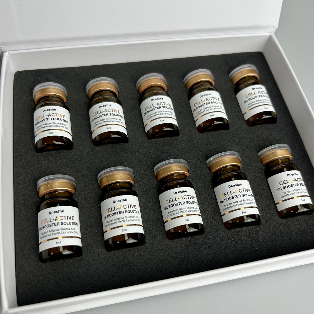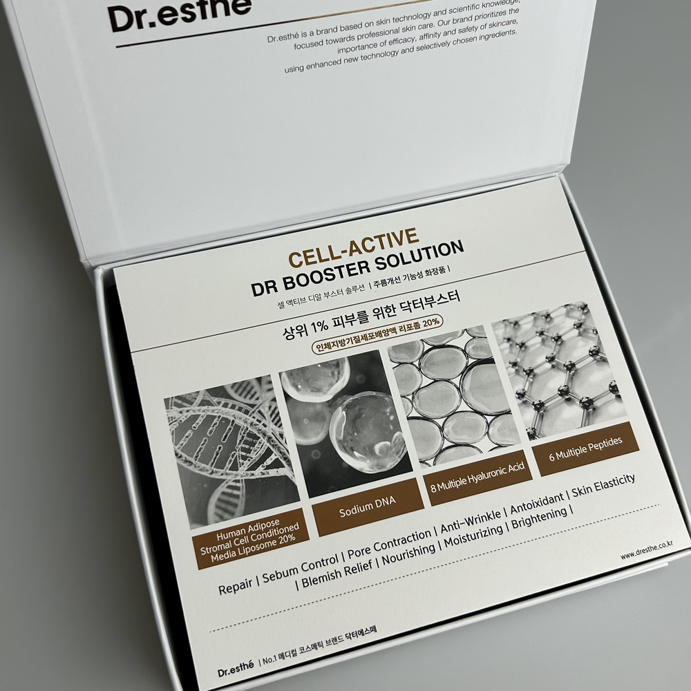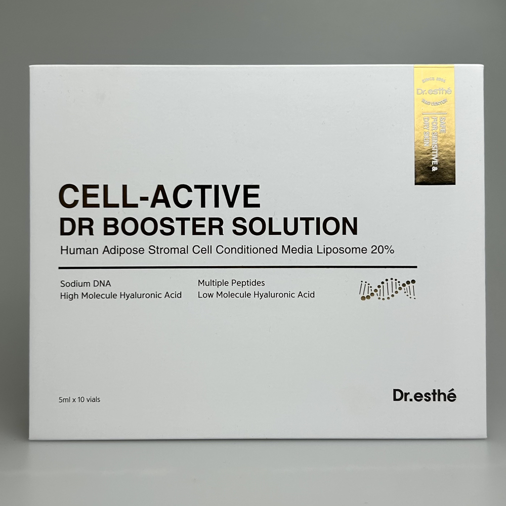Клеточный бустер с 20% кондиционированной липосомной средой жировых стромальных клеток человека (ADSC) и 10 различными типами факторов роста способствует мгновенной регенерации тусклой, возрастной и уставшей кожи. Средство глубоко увлажняет, подтягивает влагу из более глубоких слоёв к поверхности, выравнивает рельеф, заполняет морщины и неровности, делая кожу гладкой, плотной и обновлённой. Инновационная технология липосомальной доставки обеспечивает глубокое проникновение активных веществ без потери эффективности. DR.ESTHÉ Cell-Active DR Booster Solution действует сразу на 10+ кожных проблем: восстановление, увлажнение, эластичность, питание, осветление, контроль себума, сужение пор, антиоксидантная защита и выравнивание рельефа.