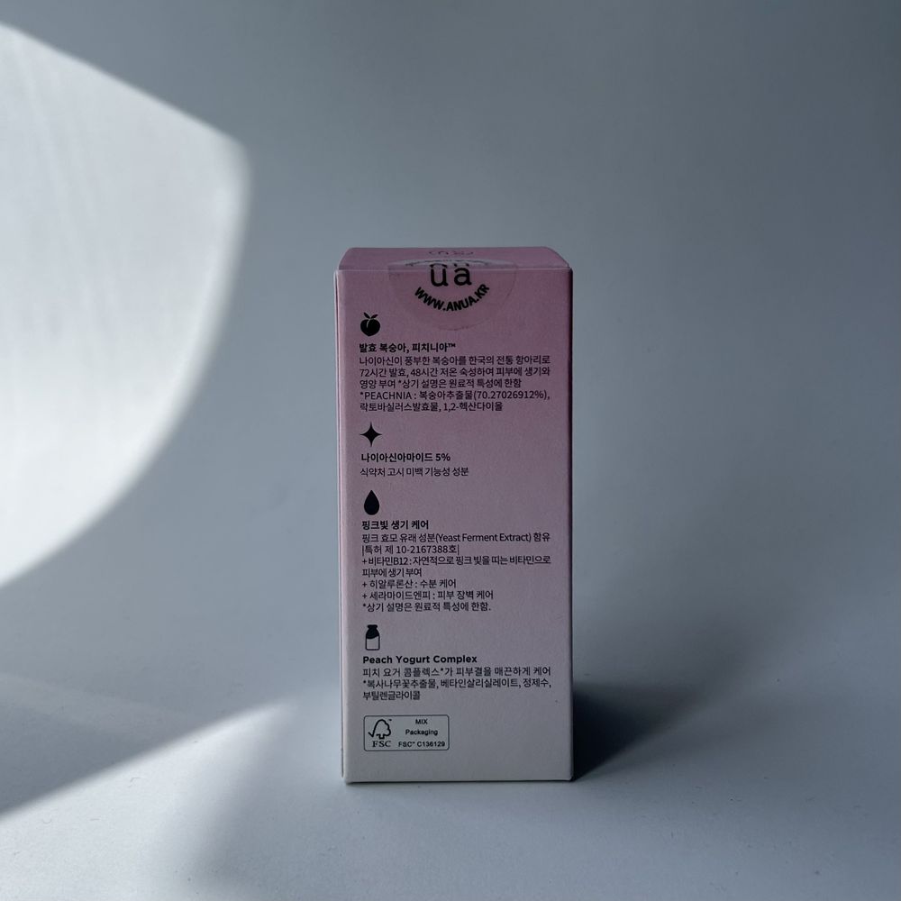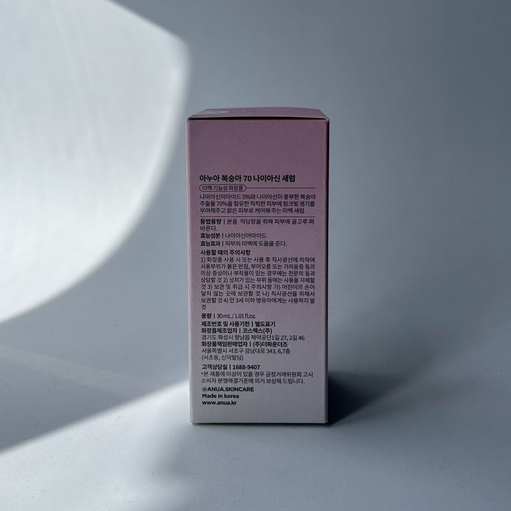 В основе состава 70 % запатентованного комплекса PEACHNIA (Peach Yogurt Complex), полученный с помощью процесса ферментации экстракта персика в течение 120 часов, что позволяет сохранить все необходимые свойства компонента, при этом бережно воздействовать на кожу. Витамин В12 придает сыворотке натуральный розовый цвет. Жидкая текстура молочка нежно обволакивает и впитывается в кожу, не оставляя неприятной липкости. Anua Peach 70% Niacinamide имеет приятный сладкий аромат персика.