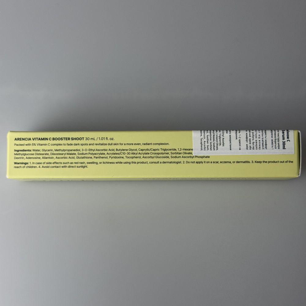 Концентрированная бустерная сыворотка с комплексом витамина C для коррекции пигментации и повышения упругости кожи. Улучшает внешний вид постакне и тёмных пятен, устраняет тусклость и неравномерный тон. Обеспечивает антиоксидантную защиту и поддерживает здоровый кожный барьер. Выравнивает шероховатую текстуру, помогает уменьшить видимость пор, делая кожу более свежей и обновлённой. Многофункциональная формула дополнительно обогащена ниацинамидом, глутатионом и витамином E для здоровой, свежей, гладкой и сияющей кожи. ARENCIA Vitamin C Booster Shot с лёгкой текстурой быстро впитывается, обеспечивая коже здоровое сияние без ощущения тяжести. Идеально подходит для тусклой или уставшей кожи, которая хочет вернуть свежий и сияющий вид.