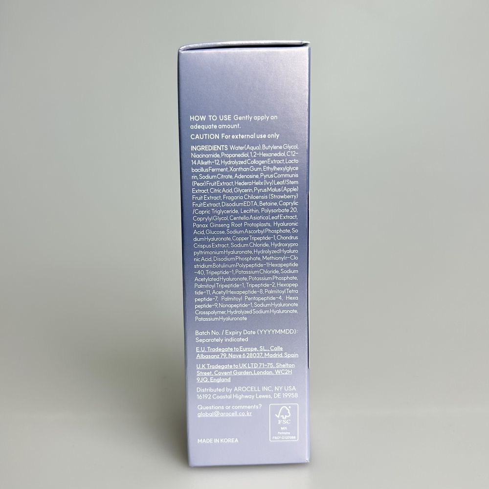 | Состав | Purified water, butylene glycol, niacinamide, propanediol, 1,2-hexanediol, hydrolyzed collagen extract, C12-14 alkyl-12, lactobacillus starter, xanthan gum, ethylhexyl glycerin, sodium citrate, adenosine, pear extract, pine leaf/stem extract, citric acid, glycerin, apple extract, beech strawberry extract, EDTA, betaine, caprylic/caprylic triglyceride, lecithin, polysorbate 20, caprylyl glycol, centella asiatica leaf extract, ginseng root protoplast, hyaluronic acid, glucose, ascorbyl phosphate, sodium hyaluronate, copper tripeptide-1, Irish moss extract, sodium chloride, hydroxypropyltrimonium hyaluronate, hydrolyzed hyaluronic acid, dinitrium phosphate, methionyl al-clostridium botulinum polypeptide-1 hexapeptide-40, tripeptide-1, potassium chloride, sodium acetylated hyaluronate potassium phosphate, palmitoyl tripeptide-1, tripeptide-2, hexapeptide-11, acetyl hexapeptide-8, palmitoyl tetrapeptide-7, palmitoyl pentapeptide-4, hexapeptide-9, nonapeptide-1, sodium hyaluronate cross-polymer, hydrolyzed sodium hyaluronate, potassium hyaluronate Указанный состав является ознакомительным и может быть не точнымо по разным причинам (изменение состава производителем, ошибки при наполнении сайта и прочее). Точный состав смотрите на этикетке или упаковке средства. |