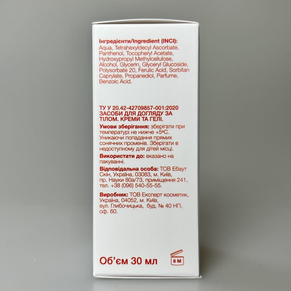 | Состав | Aqua, Tetrahexyldecyl Ascorbate, Panthenol, Tocopheryl Acetate, Hydroxypropyl Methylcellulose, Alcohol, Glycerin, Glyceryl Glucoside, Polysorbate 20, Ferulic Acid, Sorbitan Caprylate, Propanediol, Parfume, Benzoic Acid Указанный состав является ознакомительным и может быть не точнымо по разным причинам (изменение состава производителем, ошибки при наполнении сайта и прочее). Точный состав смотрите на этикетке или упаковке средства. |