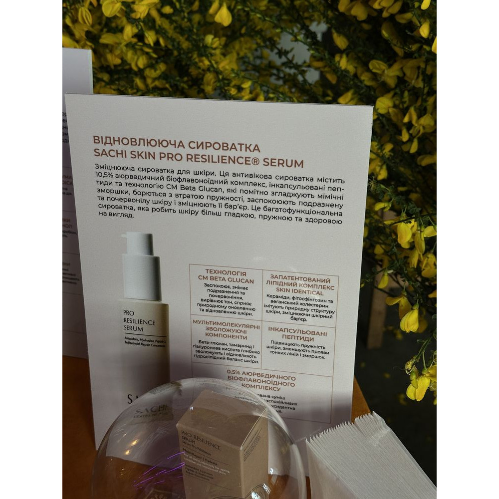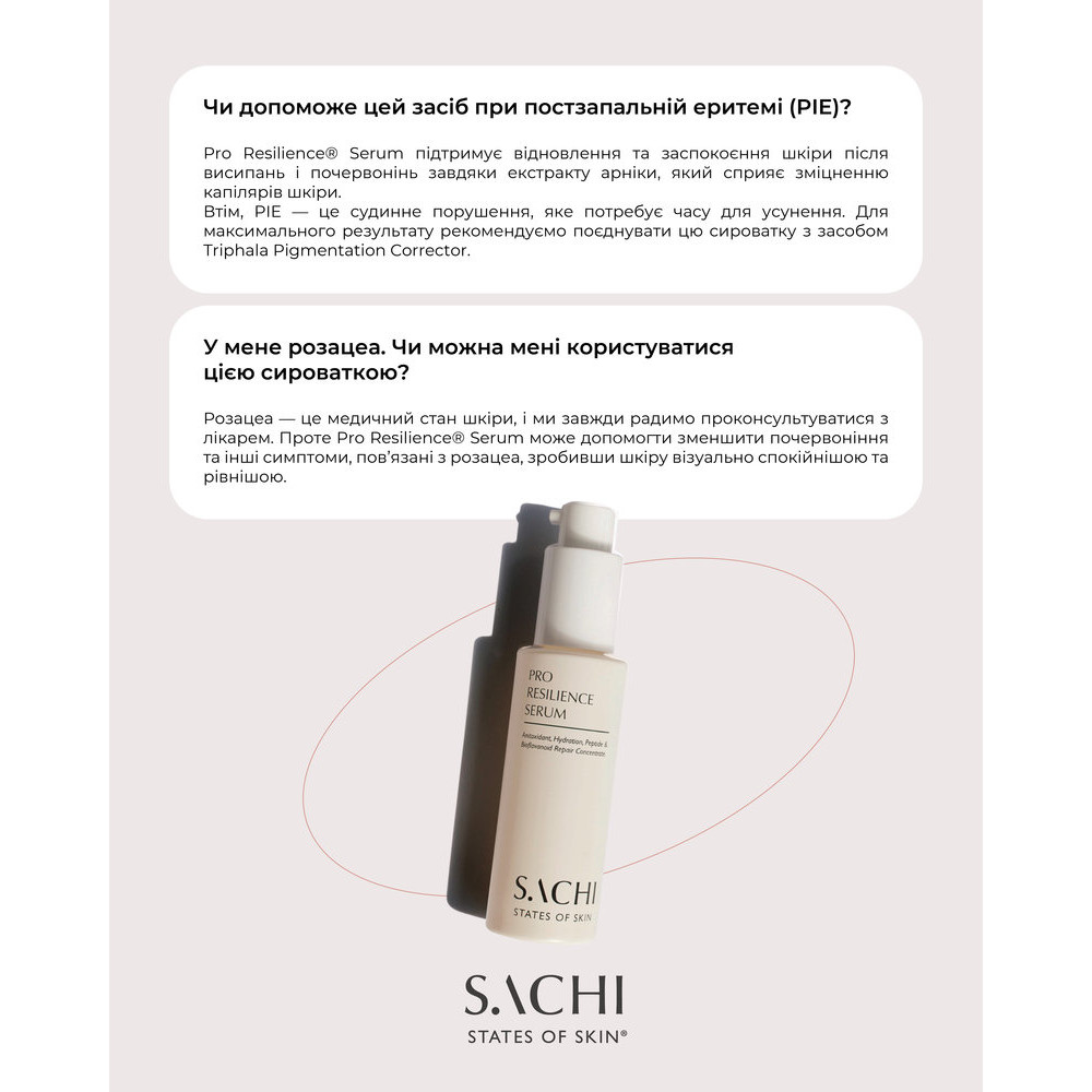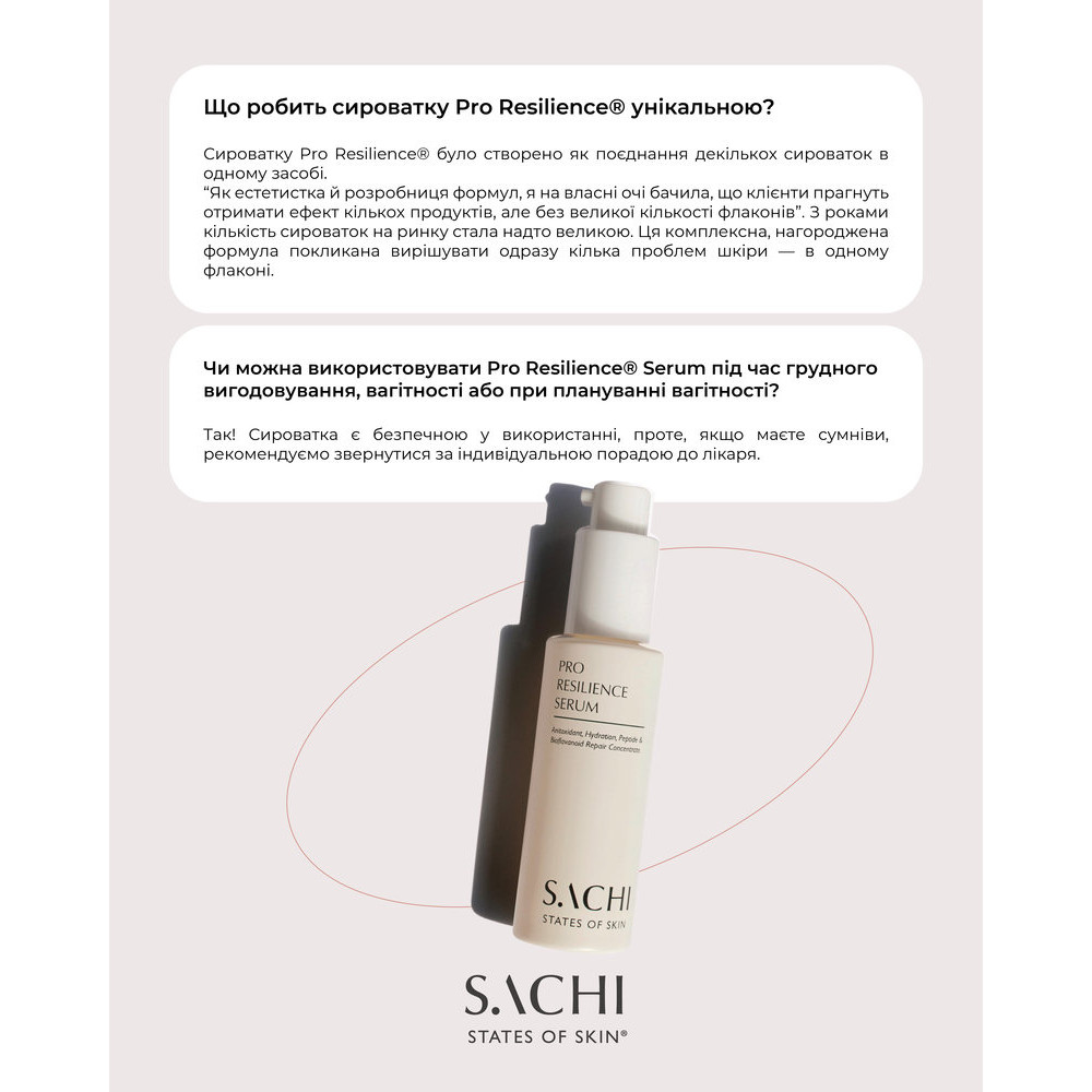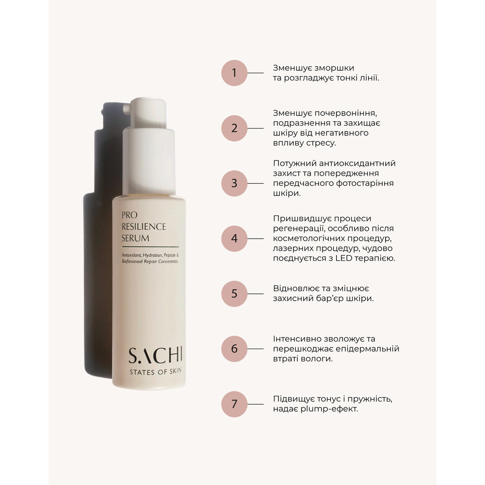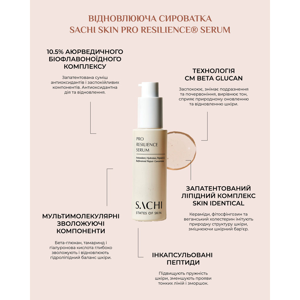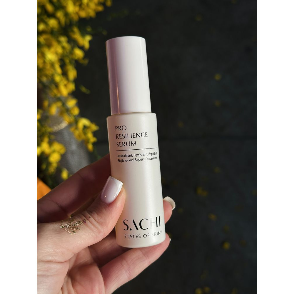 Сыворотка с многоцелевым действием на основе запатентованного 10,5% аюрведического восстанавливающего комплекса биофлавоноидов и инновационной технологии целевой доставки активных ингредиентов с помощью капсуляции и нанотехнологий. Обладает успокаивающим, увлажняющим, укрепляющим, противовоспалительным и антивозрастным действием, подходит даже для чувствительной или раздражённой кожи. SACHI Pro Resilience Serum сочетает в себе силу и пользу аюрведических растительных компонентов и передовые дерматологические технологии для повышения устойчивости кожи и поддержки её природного цикла обновления. Сыворотка имеет шелковистую, нежирную гелевую текстуру, которая легко впитывается, дарит ощущение свежести и комфорта, делает кожу упругой, спокойной и «собранной» на ощупь — без ощущения тяжести. Она повышает устойчивость кожи к активным ингредиентам и помогает ей лучше воспринимать последующий уход.