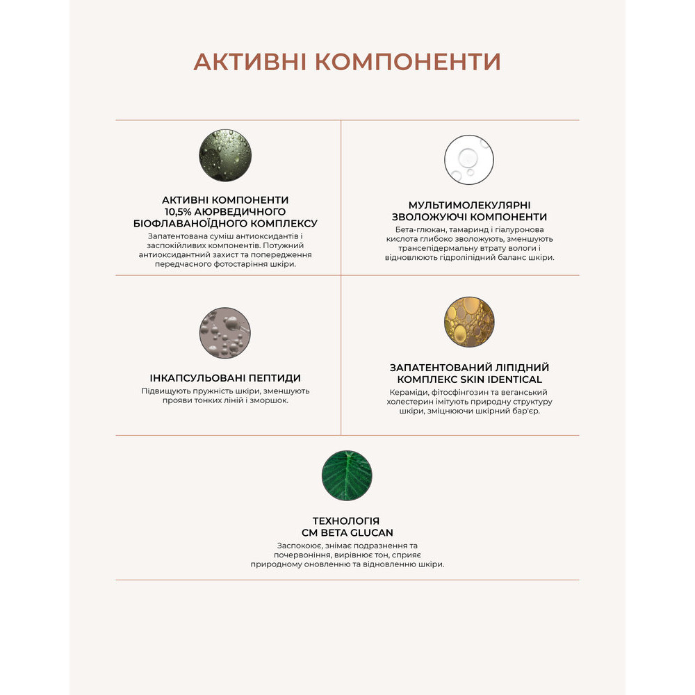 - Аюрведический биофлавоноидный комплекс 10,5% — нейтрализует вредное действие свободных радикалов, направлен на борьбу с признаками старения кожи, обострениями и неравномерным тоном.