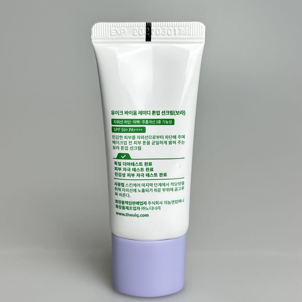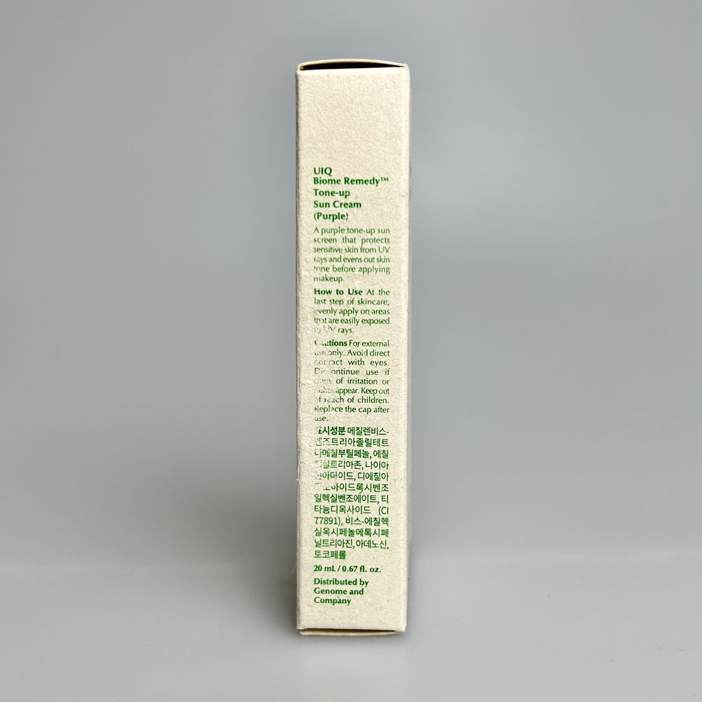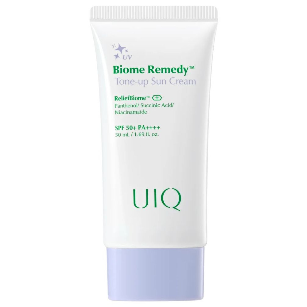Солнцезащитный крем на основе диоксида титана и современных химических фильтров обеспечивает стойкую защиту широкого спектра SPF 50 UVA/UVB, выравнивает и корректирует тон, делая кожу сияющей в течение всего дня. UIQ Biome Remedy Tone-Up Sun Cream – многофункциональная формула, разработанная для защиты кожи от вредного воздействия солнечных лучей и для придания коже ровного, безупречного тона. Ниацинамид и янтарная кислота сужают поры и уменьшают жирный блеск, пантенол питает и успокаивает, а цветокорректирующий натуральный пигмент ультрамарин фиолетового оттенка помогает нейтрализовать нежелательные серый и жёлтый оттенок, скрыть покраснения, следы усталости и тусклость. Санскрин помогает замедлять старение, минимизируя появление темных пятен, линий и морщин. Имеет легкую текстуру, мгновенно впитывается, не оставляя липкости. Подходит в качестве базы под макияж.