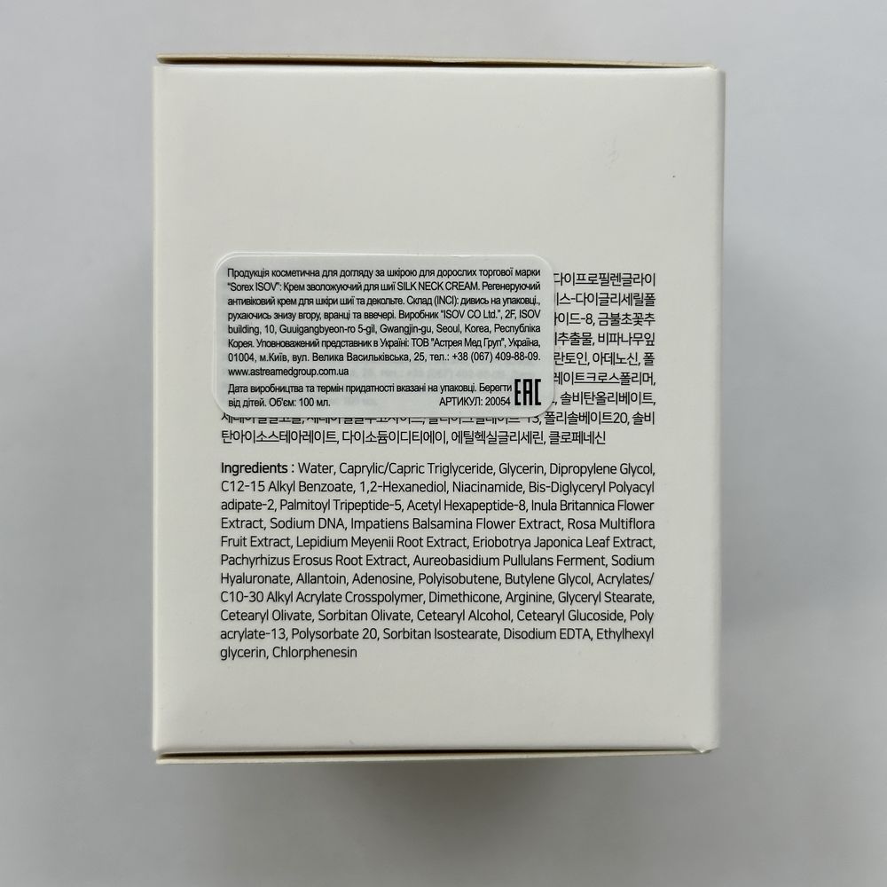 Крем для шеи с полинуклеотидами целенаправленно направлен на коррекцию возрастных изменений. Разглаживает и подтягивает кожу, уменьшает видимость колец Венеры. Основным активным ингредиентом крема выступает уникальный актив PDRN, полученный из ДНК молок лососевых рыб. Формула средства обогащена растительным комплексом ELL-6 PERFECT, компоненты которого обеспечивают ярко выраженное успокаивающее действие, устраняют зуд и раздражение, укрепляют защитные функции кожи, защищая её от агрессивного воздействия окружающей среды и способствуя обновлению. Благодаря ISOV SOREX Silk Neck Cream кожа в области шеи и декольте становится более подтянутой и упругой, заломы становятся менее заметными. Крем также глубоко питает и увлажняет кожу, укрепляет дермальный матрикс, предотвращает появление второго подбородка. Нежная текстура крема мгновенно впитывается в кожу, делая её мягкой и бархатистой, не оставляя липкости.