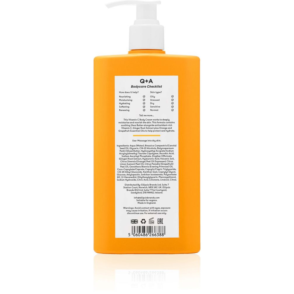 Питательный крем с мягкой текстурой, обогащён маслом ши и корнем имбиря, глубоко увлажняет, смягчает и наполняет эпидермис жизненной энергией. Проявляет антиоксидантное действие, стирает признаки старения и способствует стремительной регенерации. Устраняет сухость и признаки обезвоженности, повышает упругость и эластичность. Разглаживает текстуру, осветляет и выравнивает тон. Регулярное использование помогает избавиться от зуда, шелушений и неприятного ощущения стянутости. Крем покрывает кожу свежим ароматом апельсиновой цедры и грейпфрута с лёгкими нотами сладкого лимона. Делает сухую и тусклую кожу молодой, упругой и сияющей. Q+A Vitamin C Body Cream является веганским, не тестируется на животных.