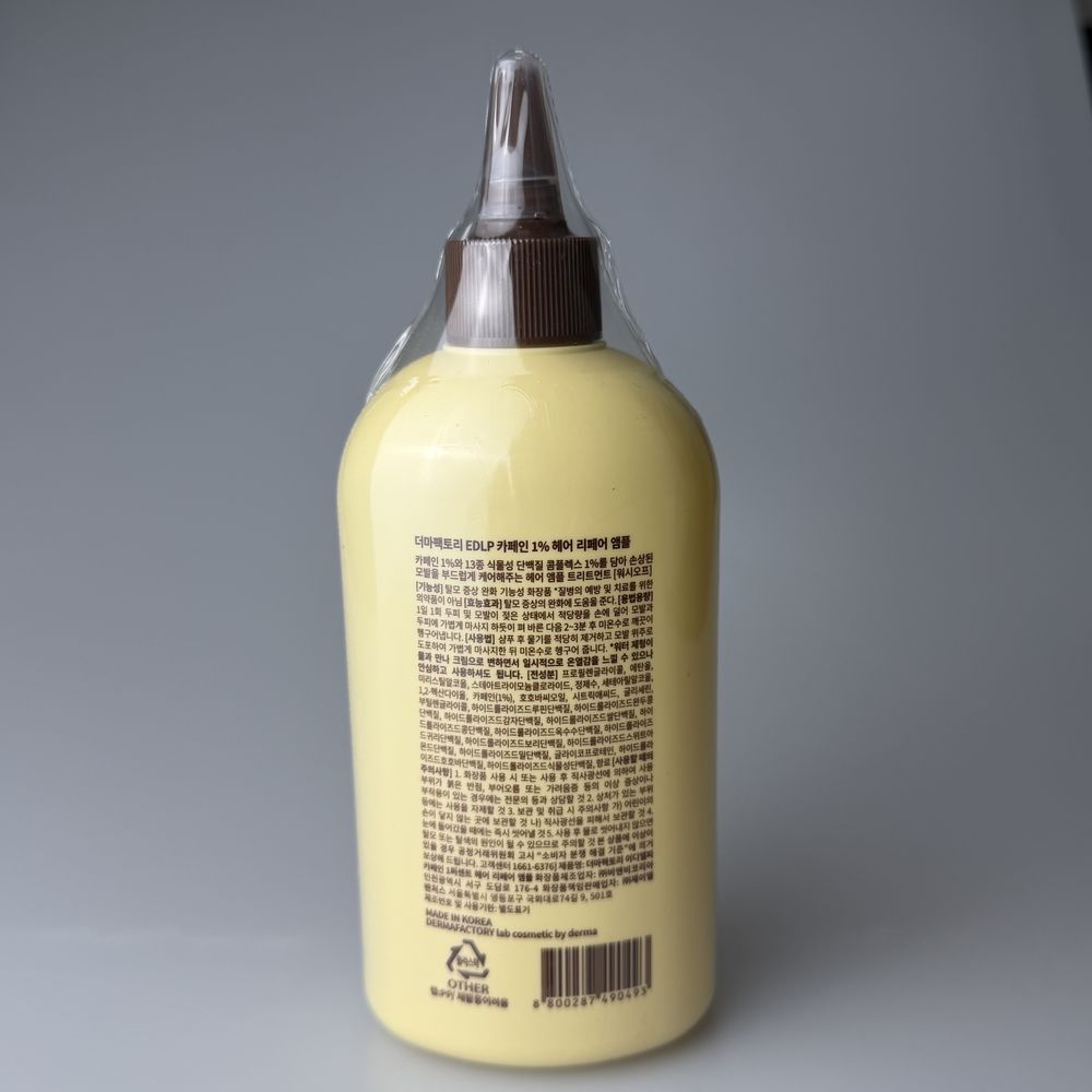 Функциональная ампула для ухода за волосами и кожей головы. Содержит 1% кофеина и комплекс из 13 растительных протеинов, которые питают кожу головы и повреждённые волосы по всей длине, делая их гладкими, шелковистыми и ухоженными. Прозрачная водянистая текстура быстро проникает в кожу головы и волосы, а при контакте с водой трансформируется в крем, что способствует более глубокому проникновению активных компонентов и лучшему усвоению питательных веществ. Формула ampoule-to-cream глубоко воздействует на повреждённую кутикулу, образуя питательное покрытие с эффектом, подобным паровому уходу, что улучшает гладкость и плотность волос по длине. Одновременно средство поддерживает тонус кожи головы, укрепляет волосы в прикорневой зоне и способствует более выраженному прикорневому объёму без утяжеления. Средство обладает изысканной цитрусово-цветочной композицией со свежими нотами лайма и мягкого мускуса, которая деликатно раскрывается на волосах после использования. Благодаря DERMA FACTORY Caffeine 1% Hair Repair Ampoule волосы становятся мягкими, гладкими и ухоженными, приобретают естественный блеск, выглядят более послушными и визуально более объёмными.