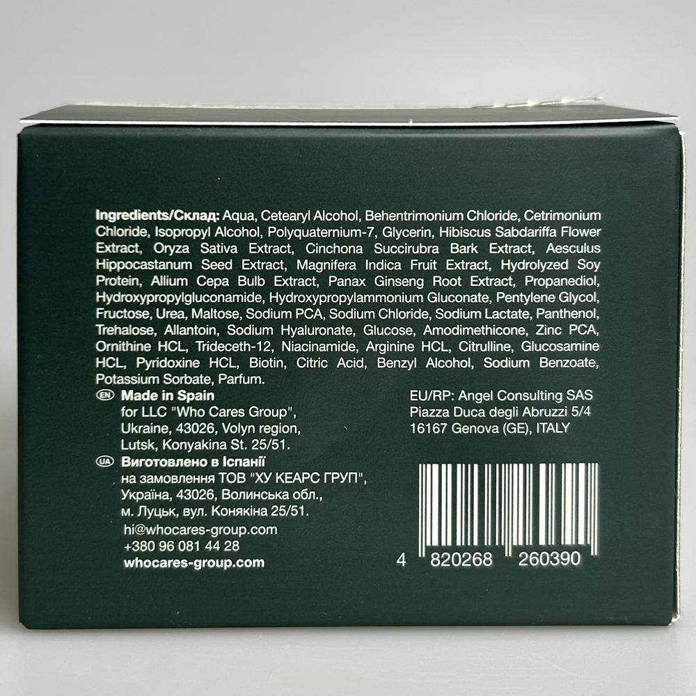 | Состав | Aqua, Cetearyl Alcohol, Behentrimonium Chloride, Cetrimonium Chloride, Isopropyl Alcohol, Polyquaternium-7, Glycerin, Hibiscus Sabdariffa Flower Extract, Oryza Sativa Extract, Cinchona Succirubra Bark Extract, Aesculus Hippocastanum Seed Extract, Magnifera Indica Fruit Extract, Hydrolyzed Soy Protein, Allium Cepa Bulb Extract, Panax Ginseng Root Extract, Propanediol, Hydroxypropylgluconamide, Hydroxypropylammonium Gluconate, Pentylene Glycol, Fructose, Urea, Maltose, Sodium PCA, Sodium Chloride, Sodium Lactate, Panthenol, Trehalose, Allantoin, Sodium Hyaluronate, Glucose, Amodimethicone, Zinc PCA, Ornithine HCL, Trideceth-12, Niacinamide, Arginine HCL, Citrulline, Glucosamine HCL, Pyridoxine HCL, Biotin, Citric Acid, Benzyl Alcohol, Sodium Benzoate, Potassium Sorbate, Parfum Указанный состав является ознакомительным и может быть не точнымо по разным причинам (изменение состава производителем, ошибки при наполнении сайта и прочее). Точный состав смотрите на этикетке или упаковке средства. |