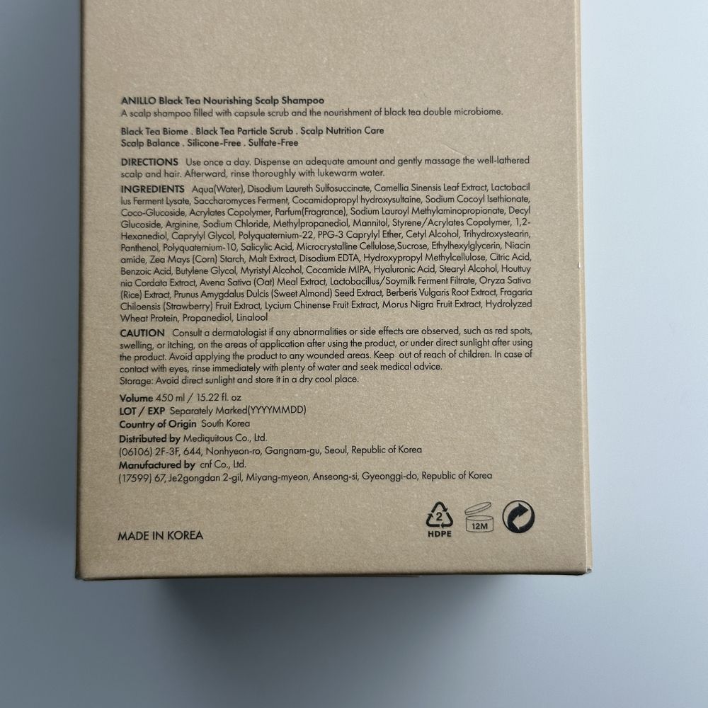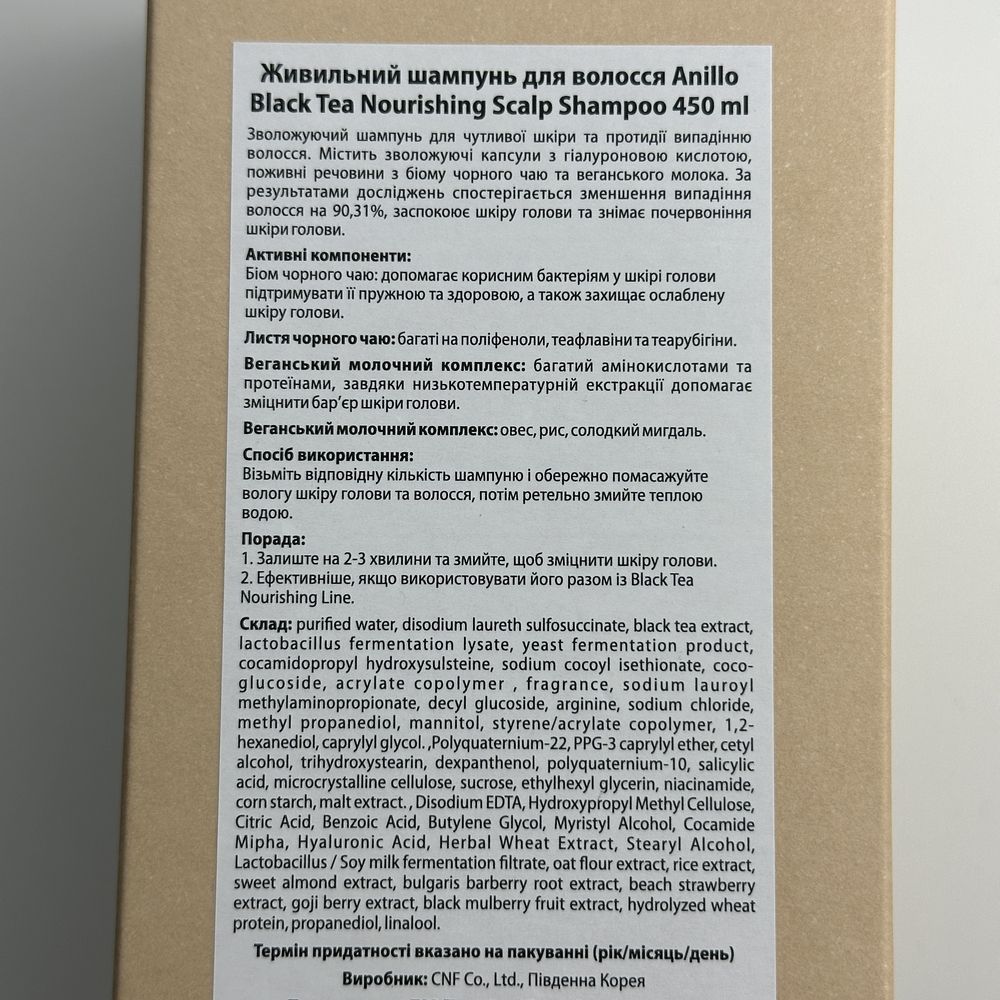 Когда чрезвычайно остро стоит проблема постоянной потери волос, не стоит этим пренебрегать. Важно обеспечить своевременное питание пострадавшим корням. Укрепить поврежденные волосы и обеспечить их необходимым питанием способен ANILLO Black Tea Nourishing Scalp Shampoo, изготовленный известным корейским брендом. Специалисты в области косметологии создали уникальную формулу питательного шампуня, которая позволяет снизить выпадение волос на 90%. Косметическое средство подходит для чувствительной кожи. Он изготовлен из натуральных компонентов с добавлением гиалуроновой кислоты. К ключевым преимуществам шампуня относятся: