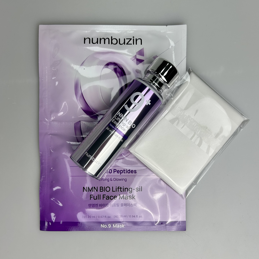 Набор с профессиональным лифтинг-эффектом сочетает мощную антивозрастную эссенцию с коэнзимом, NAD+ и 50 пептидами и тканевую 3D-маску с эффектом подтяжки. Вместе они заметно улучшают упругость и эластичность кожи, разглаживают морщины, добавляют тонус и свежесть и делают контуры лица более чёткими. NUMBUZIN No.9 NAD Bio Lifting — это комплексный уход, с которым кожа восстанавливается, укрепляется, наполняется сиянием, становится упругой и заметно более молодой. Подходит для всех типов кожи, особенно при потере тонуса, появлении морщин, дряблости и сниженной эластичности.