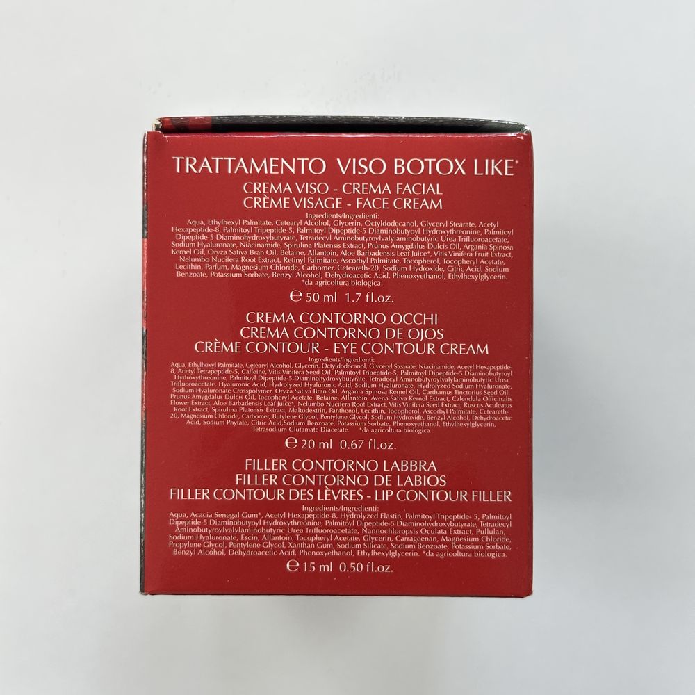 | Состав | Low Up Botox Like Up: Aqua, Ethylhexyl Palmitate, Ceteary' Alcohol, Clycerin, Octyldodecanol, Glycery Stearate, Acetyl Hexapeptide-8, Palmitoy| Tripeptide-5, Palmitoy! Dipeptide-5 Diaminobutyoyl Hydroxythreonine, Palmitoyl Dipeptide-5 Diaminohydroxybutyrate, Tetradecyl Aminobutyroy/valylaminobutyric Urea Trifluoroacetate, Sodium Hyaluronate, Niacinamide, Spirulina Platensis Extract, Prunus Amygdalus Dulcis Oil, Argania Spinosa Kernel Oil, Oryza Sativa Bran Oil, Betaine, Allantoin, Aloe Barbadensis Leat Juice*, Vitis Vinifera Fruit Extract, Nelumbo Nucifera Root Extract, Retinyl Palmitate, Ascorbyl Palmitate, Tocopherol, Tocopheryl Acetate, Lecithin, Parfum, Magnesium Chloride, Carbomer, Ceteareth-20, Sodium Hydroxide, Citric Acid, Sodium Benzoate, Potassium Sorbate, Benzyl Alcohol, Dehydroac. Low Up Botox Like Up Eye Contour Cream: Aqua, Ethylhexyl Palmitate, Cetearyl Alcohol, Glycerine, Octyldodecanol, Glyceryl Stearate, Niacinamide, Acetyl Hexapeptide-8, Acetyl Tetrapeptide-5, Caffeine, Vitis Vinifera Seed Oil, Palmitoyl Tripeptide-5, Palmitoyl Dipeptide-5, Diaminobutyroyl Hydroxythreonine, Palmitoyl Dipeptide-5, Diaminohydroxybutyrate, Aminobutyroyl/valylaminobutyric Urea Trifluoroacetate, Hyaluronic Acid, Hydrolyzed Hyaluronic Acid, Sodium Hyaluronate, Hydrolyzed Sodium Hyaluronate, Sodium Hyaluronate Crosspolymer, Oryza Sativa Bran Oil, Argania Spinosa Kernel Oil, Carthamus Tinctorius Seed Oil, Prunus Amygdalus Dulcis Oil, Tocopheryl Acetate, Betaine, Allantoin, Avena Sativa Kernel Extract, Calendula Officinalis Flower Extract, Aloe Barbadensis Leaf Juice*, Nelumbo Nucifera Root Extract, Vitis Vinifera Seed Extract, Ruscus Aculeatus Root Extract, Spirulina Platensis Extract, Maltodextrin, Panthenol, Lecithin, Tocopherol, Ascorbyl Palmitate, Ceteareth-20, Magnesium Chloride, Carbomer, Butylene Glycol, Pentylene Glycol, Sodium Hydroxide, Benzyl Alcohol, Dehydroacetic Acid, Sodium Phytate, Citric Acid, Sodium Benzoate, Potassium Sorbate, Phenoxyethanol, Ethylhexylglycerin, Tetrasodium Glutamate Diacetate. * Ingredients from organic farming (da agricoltura biologica). Low Up Filler Contorno Labbra:Aqua, Acacia Senegal Gum*, Acetyl Hexapeptide-8, Hydrolyzed Elastin, Palmitoyl Tripeptide- 5, Palmitoyl Dipeptide-5 Diaminobutyoyl Hydroxythreonine, Palmitoyl Dipeptide-5 Diaminohydroxybutyrate, Tetradecyl Aminobutyroylvalylaminobutyric Urea Trifluoroacetate, Nannochloropsis Oculata Extract, Pullulan, Sodium Hyaluronate, Escin, Allantoin, Tocopheryl Acetate, Glycerin, Carrageenan, Magnesium Chloride, Propylene Glycol, Pentylene Glycol, Xanthan Gum, Sodium Silicate, Sodium Benzoate, Potassium Sorbate, Benzyl Alcohol, Dehydroacetic Acid, Phenoxyethanol, Ethylhexylglycerin. Указанный состав является ознакомительным и может быть не точнымо по разным причинам (изменение состава производителем, ошибки при наполнении сайта и прочее). Точный состав смотрите на этикетке или упаковке средства. |