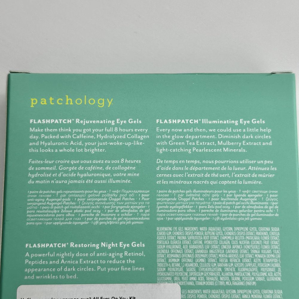 Набор патчей для чувствительной кожи у глаз удобно использовать для знакомства с продукцией бренда PATCHOLOGY или во время путешествий. Одноразовые патчи легко положить в сумочку и применить при необходимости. Набор All Eyes On You Kit включает в себя антивозрастные патчи, ночные с восстановительным действием и обогащенные витамином С для сияющей кожи.
