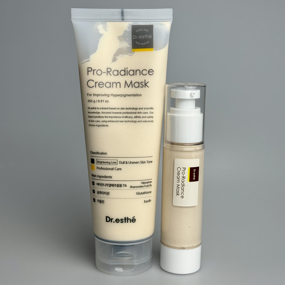 Професійна відбілювальна маска-крем для вирівнювання тону та корекції гіперпігментації. Заспокоює почервоніння та усуває нерівномірність кольору, надаючи шкірі прозорості та чистоти. Зменшує дискомфортний запальний фон, забезпечує депігментуючу дію на наявні плями та запобігає виникненню нових. В складі присутні олії з високою біосумісністю для зволоження та зменшення подразнення, завдяки чому після змивання маски шкіра залишається м’якою та зволоженою. Додатково засіб сприяє детоксу та очищенню пор завдяки каоліну з потужною поглинальною дією, який вбирає себум і токсини, та покращує стан пор. При регулярному застосуванні Dr.esthé Pro-Radiance Cream Mask тон обличчя стає рівномірним та світлішим, а сама шкіра виглядає більш зволоженою, гладкою та сяючою. Має ніжну текстуру збитих вершків. Маска-крем пройшла дерматологічний тест на подразнення – підходить навіть для чутливої шкіри та її можна використовувати щодня без подразнення. Ідеальна як база під моделінг-маску або інші професійні процедури, забезпечує бустер-ефект.