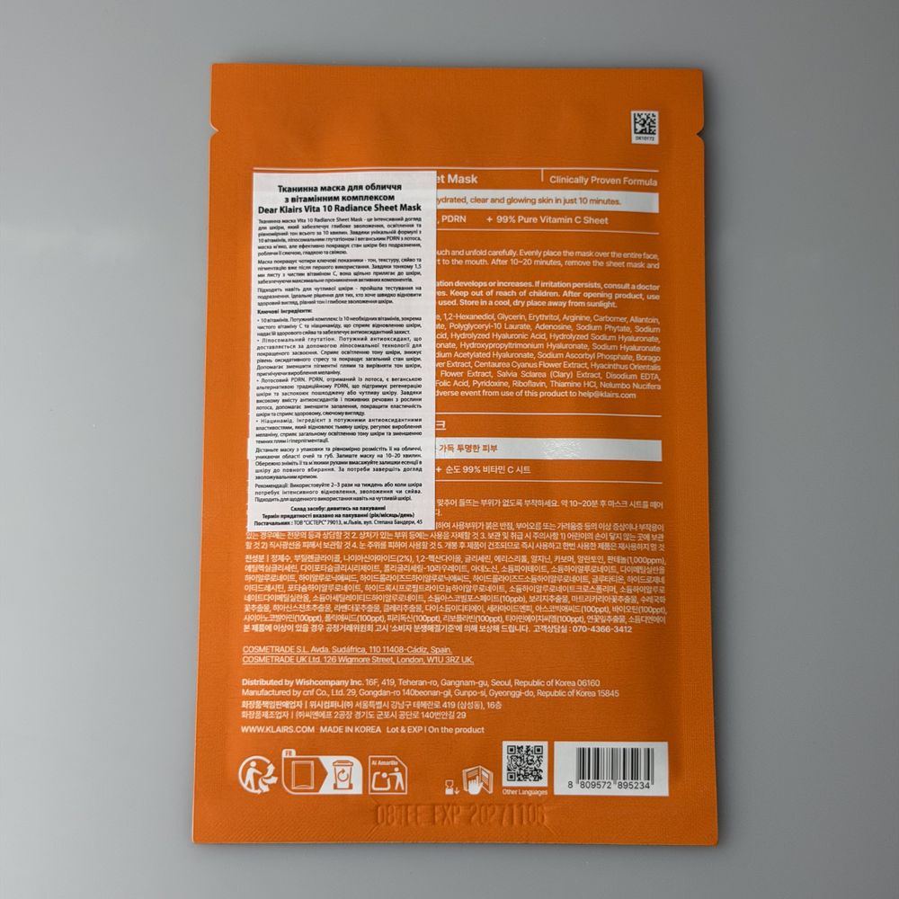 Тканинна маска з вітамінним комплексом KLAIRS Vita 10 Radiance Sheet Mask