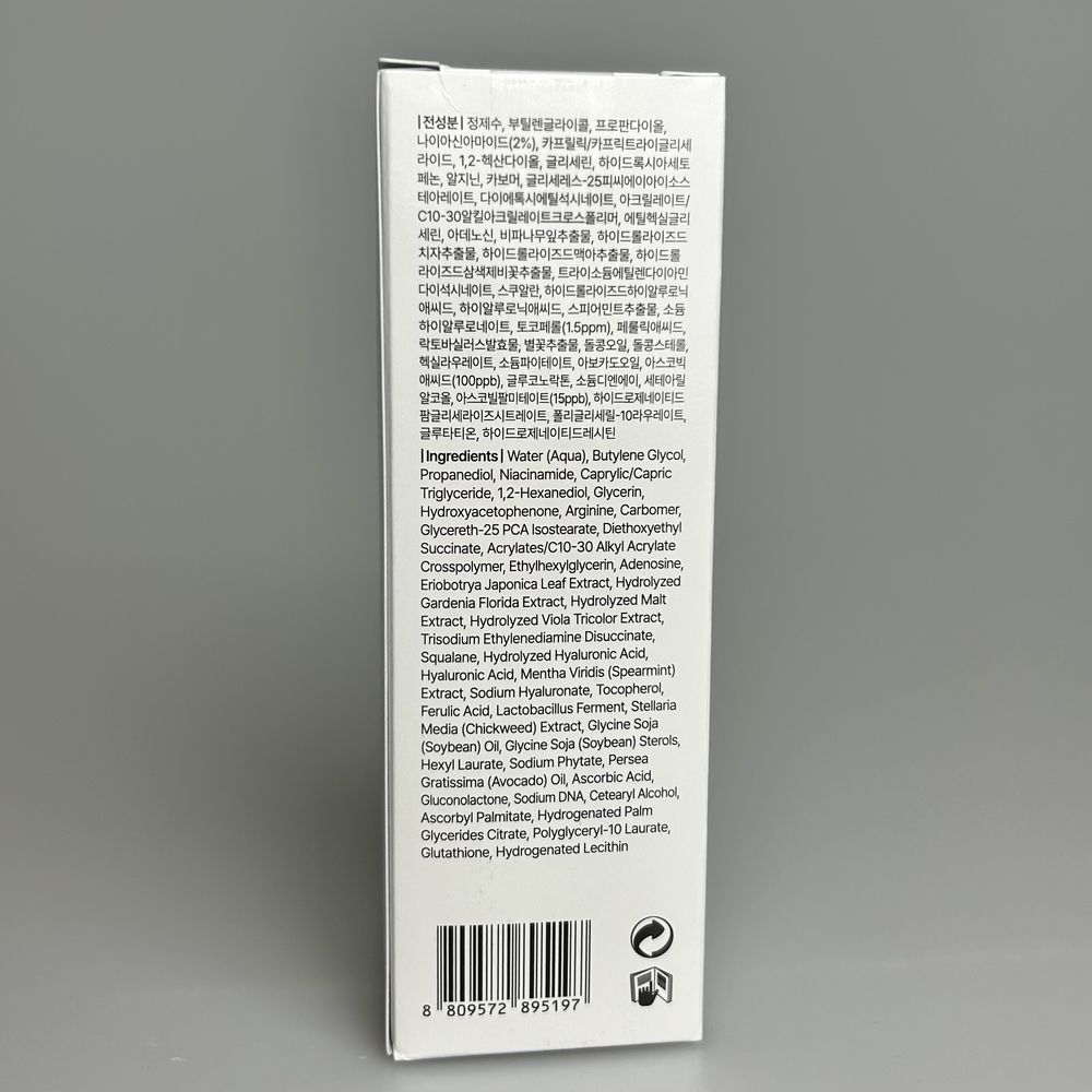 | Склад | Water (Aqua), Butylene Glycol, Propanediol, Niacinamide, Caprylic/Capric Triglyceride, 1,2-Hexanediol, Glycerin, Hydroxyacetophenone, Arginine, Carbomer, Glycereth-25 PCA Isostearate, Diethoxyethyl Succinate, Acrylates/C10-30 Alkyl Acrylate Crosspolymer, Ethylhexylglycerin, Adenosine, Eriobotrya Japonica Leaf Extract, Hydrolyzed Gardenia Florida Extract, Hydrolyzed Malt Extract, Hydrolyzed Viola Tricolor Extract, Trisodium Ethylenediamine Disuccinate, Squalane, Hydrolyzed Hyaluronic Acid, Hyaluronic Acid, Mentha Viridis (Spearmint) Extract, Sodium Hyaluronate, Tocopherol, Ferulic Acid, Lactobacillus Ferment, Stellaria Media (Chickweed) Extract, Glycine Soja (Soybean) Oil, Glycine Soja (Soybean) Sterols, Hexyl Laurate, Sodium Phytate, Persea Gratissima (Avocado) Oil, Ascorbic Acid, Gluconolactone, Sodium DNA, Cetearyl Alcohol, Ascorbyl Palmitate, Hydrogenated Palm Glycerides Citrate, Polyglyceryl-10 Laurate, Glutathione, Hydrogenated Lecithin Зазначений склад є ознайомчим і може бути не точним з різних причин (зміна складу виробником, помилки при наповненні сайту та інше). Точний склад дивіться на етикетці чи упаковці засобу. |