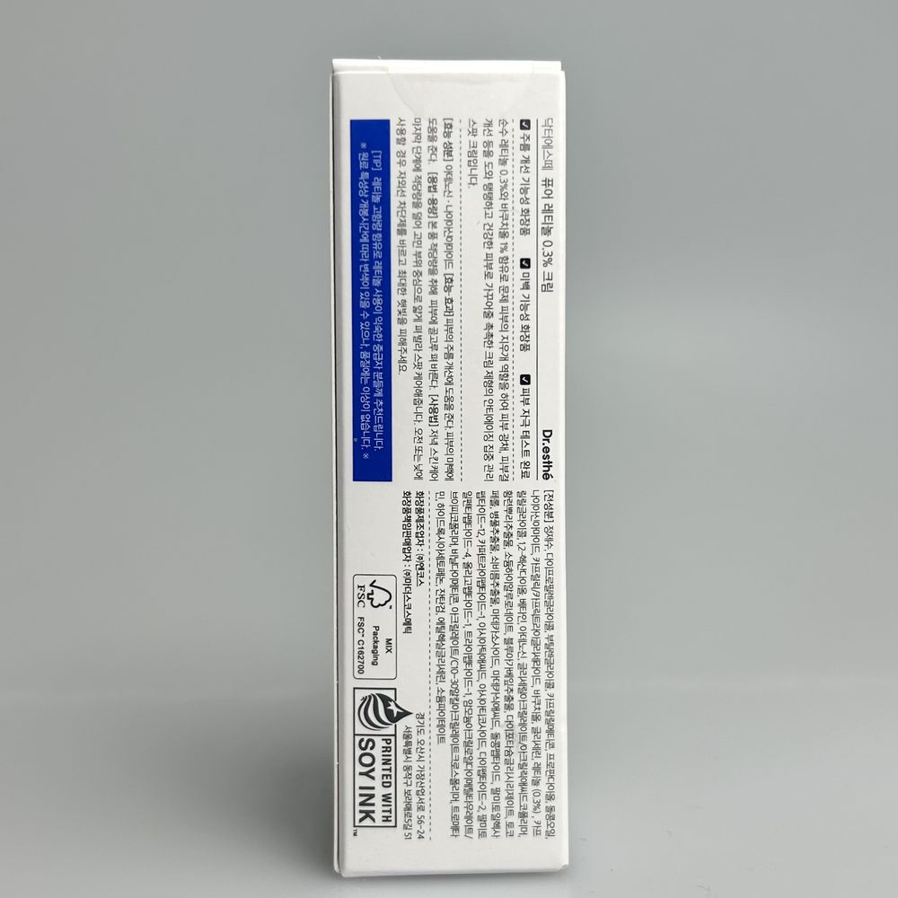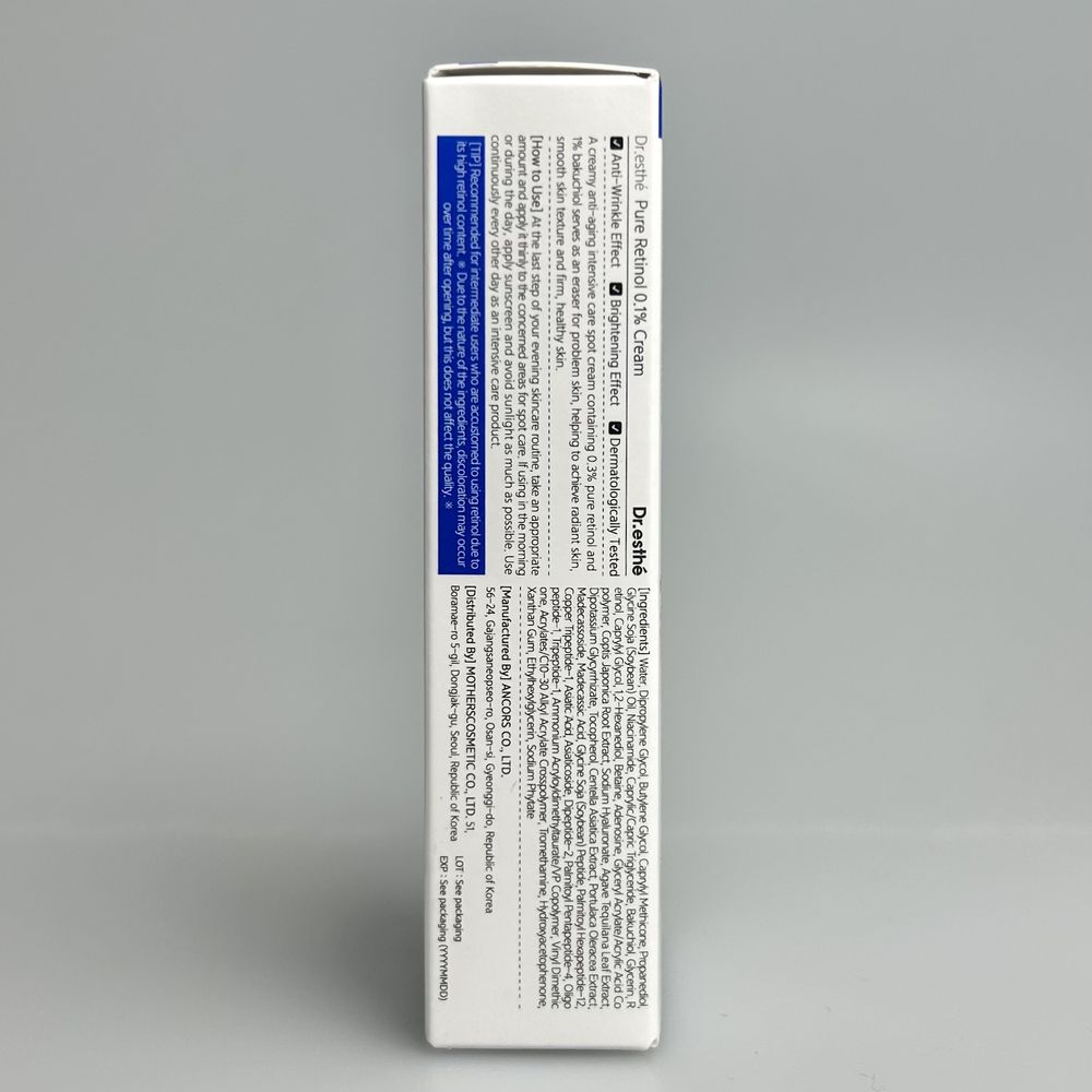 Крем-спот преміум-класу з чистим ретинолом 0.3% для точкового нанесення, який поєднує високу ефективність у боротьбі зі зморшками, втратою еластичності та нерівною текстурою шкіри. Крем усуває пігментацію, звужує пори, освітлює тон шкіри та працює з вираженими віковими змінами. Формула містить 0,3% ретинолу, відомого як «дар богів» в поєднанні з 1% бакучіолу та 7 видами пептидів, допомагає боротися зі старінням та пігментацією, підвищує еластичність шкіри. Дія засобу спрямована на глибоке оновлення, підвищення пружності та вирівнювання рельєфу шкіри, при цьому забезпечуючи антиоксидантний захист і покращення тону. Результатом використання Dr.esthé Pure Retinol 0.3% Cream є значно гладка, пружна й сяюча шкіра з рівним тоном, зменшеними порами та зморшками, та покращеною текстурою.