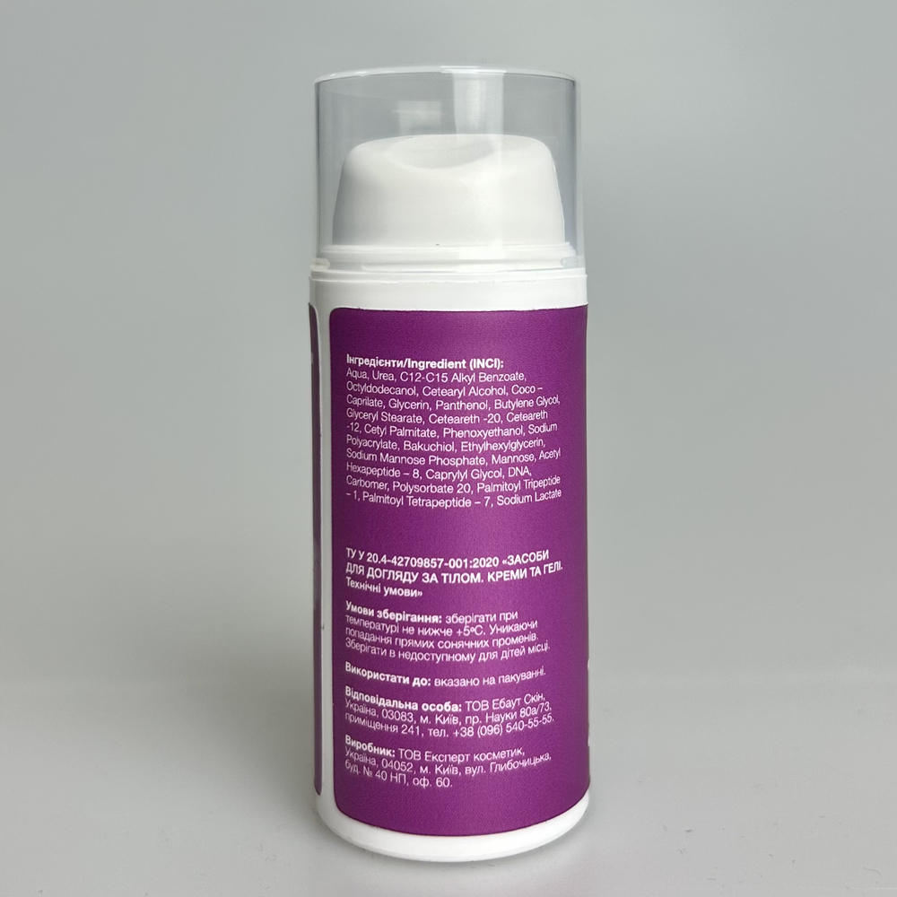 | Склад | Aqua, Urea, C12-C15 Alkyl Benzoate, Octyldodecanol, Cetearyl Alcohol, Coco – Caprilate, Glycerin, Panthenol, Butylene Glycol, Glyceryl Stearate, Ceteareth -20, Ceteareth -12, Cetyl Palmitate, Phenoxyethanol, Sodium Polyacrylate, Bakuchiol, Ethylhexylglycerin, Sodium Mannose Phosphate, Mаnnose, Acetyl Hexapeptide – 8, Caprylyl Glycol, DNA, Carbomer, Polysorbate 20, Palmitoyl Tripeptide – 1, Palmitoyl Tetrapeptide – 7, Sodium Lactate Зазначений склад є ознайомчим і може бути не точним з різних причин (зміна складу виробником, помилки при наповненні сайту та інше). Точний склад дивіться на етикетці чи упаковці засобу. |