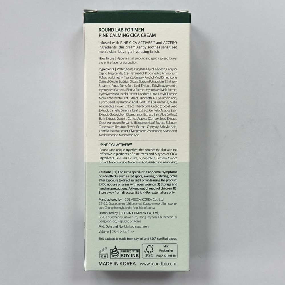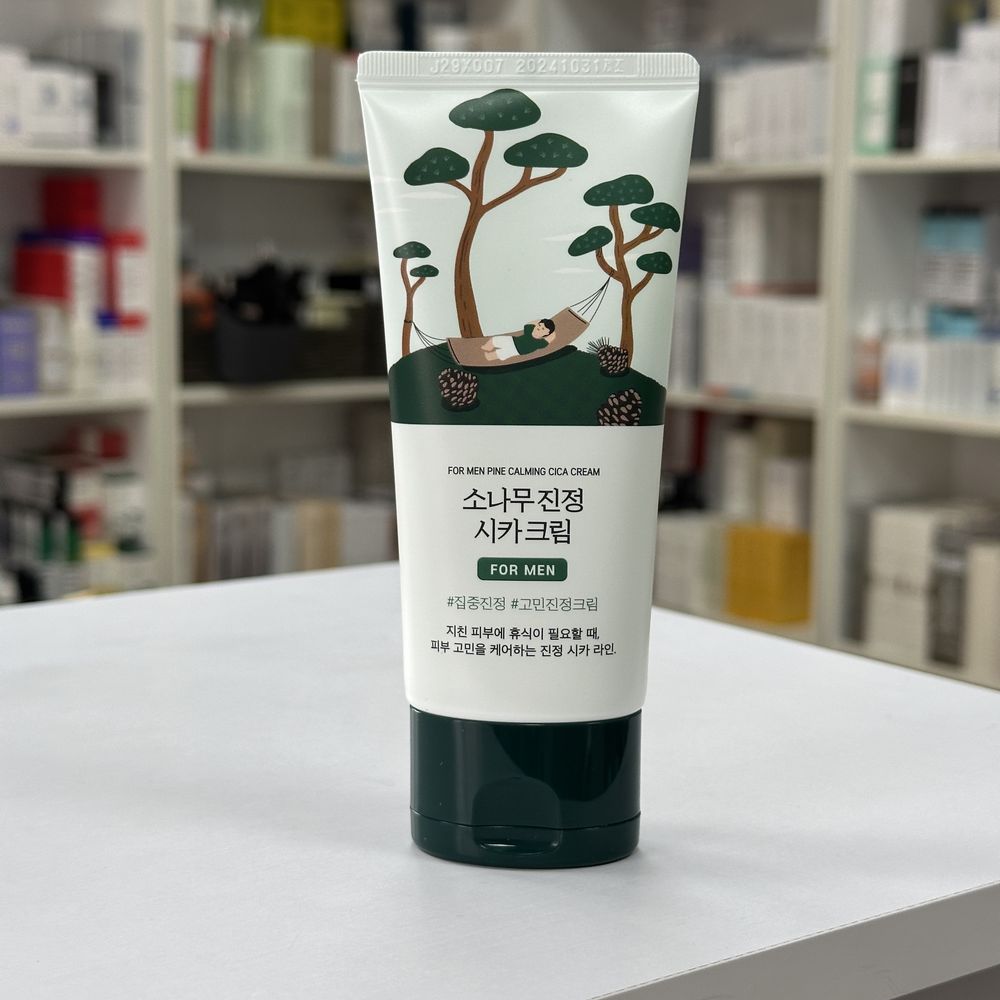 Чоловічий крем для обличчя заспокоює шкіру, робить її зволоженою, гладенькою та м'якою на дотик. Він сприяє її швидкому загоєнню після пошкоджень і зменшує прояви акне. ROUND LAB For Men Pine Calming Cica Cream: