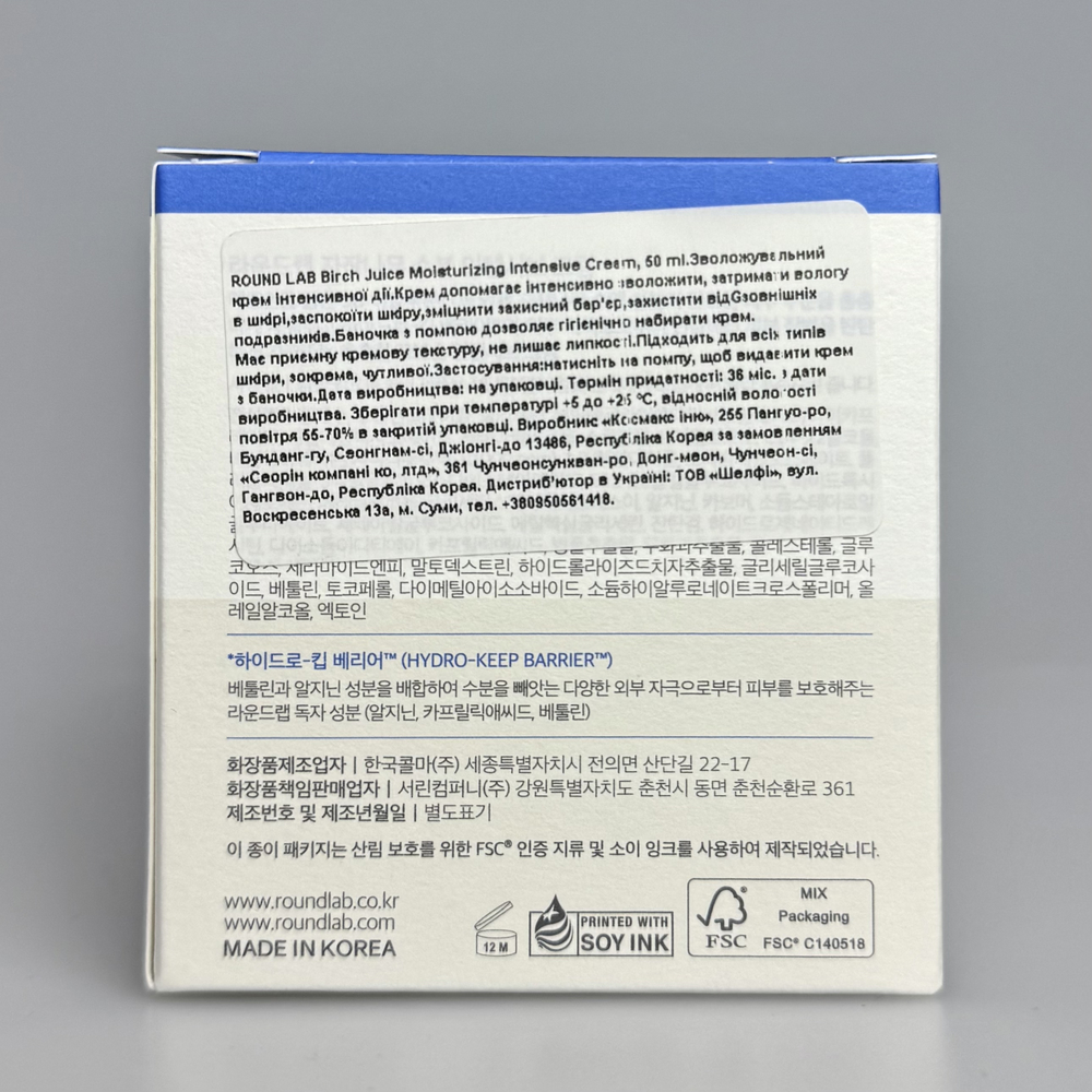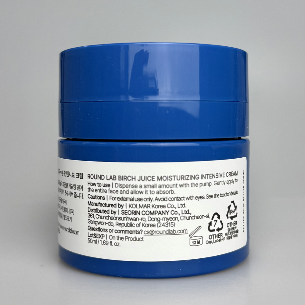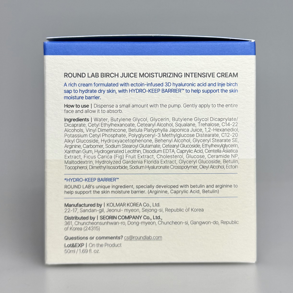 Інтенсивний бар'єрний крем з березовим соком для сухої, зневодненої шкіри, що потребує глибшого живлення. Формула забезпечує тривале багатошарове зволоження, заспокоює та зміцнює ослаблену шкіру. Завдяки 3D-гіалуроновій кислоті з ектоїном та березовому соку засіб допомагає відновити вологу та підтримувати здоровий бар’єр. Комплекс ліпідів та зволожувачів HYDRO KEEP BARRIER™ відновлює пошкоджений бар’єр, глибоко зволожує, пом’якшує та розгладжує шкіру. ROUND LAB Birch Juice Moisturizing Intensive Cream допомагає підтримувати шкіру зволоженою, заспокоєною та комфортно збалансованою. Баночка з помпою дозволяє гігієнічно набирати крем. Засіб має приємну кремову текстуру, не лишає липкості.